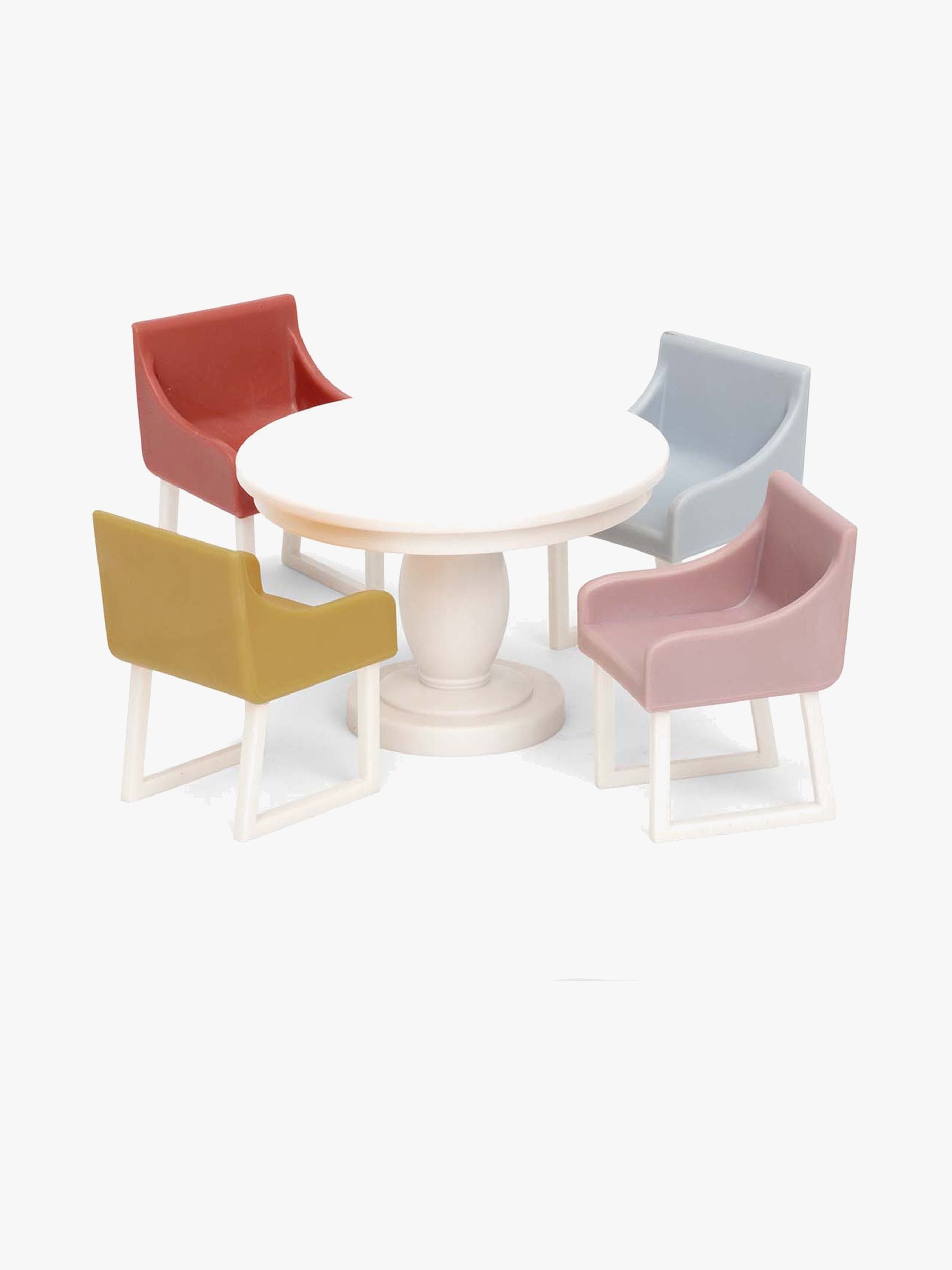 Sæt med spisemøbler fra Lundby. Dette skønne dukkehustilbehør passer perfekt ind i dukkehusets spisestue eller køkken. I sættet indgår der fire trendy stole i forskellige farver og et rundt bord. Anbefalet alder: Fra 3 år.