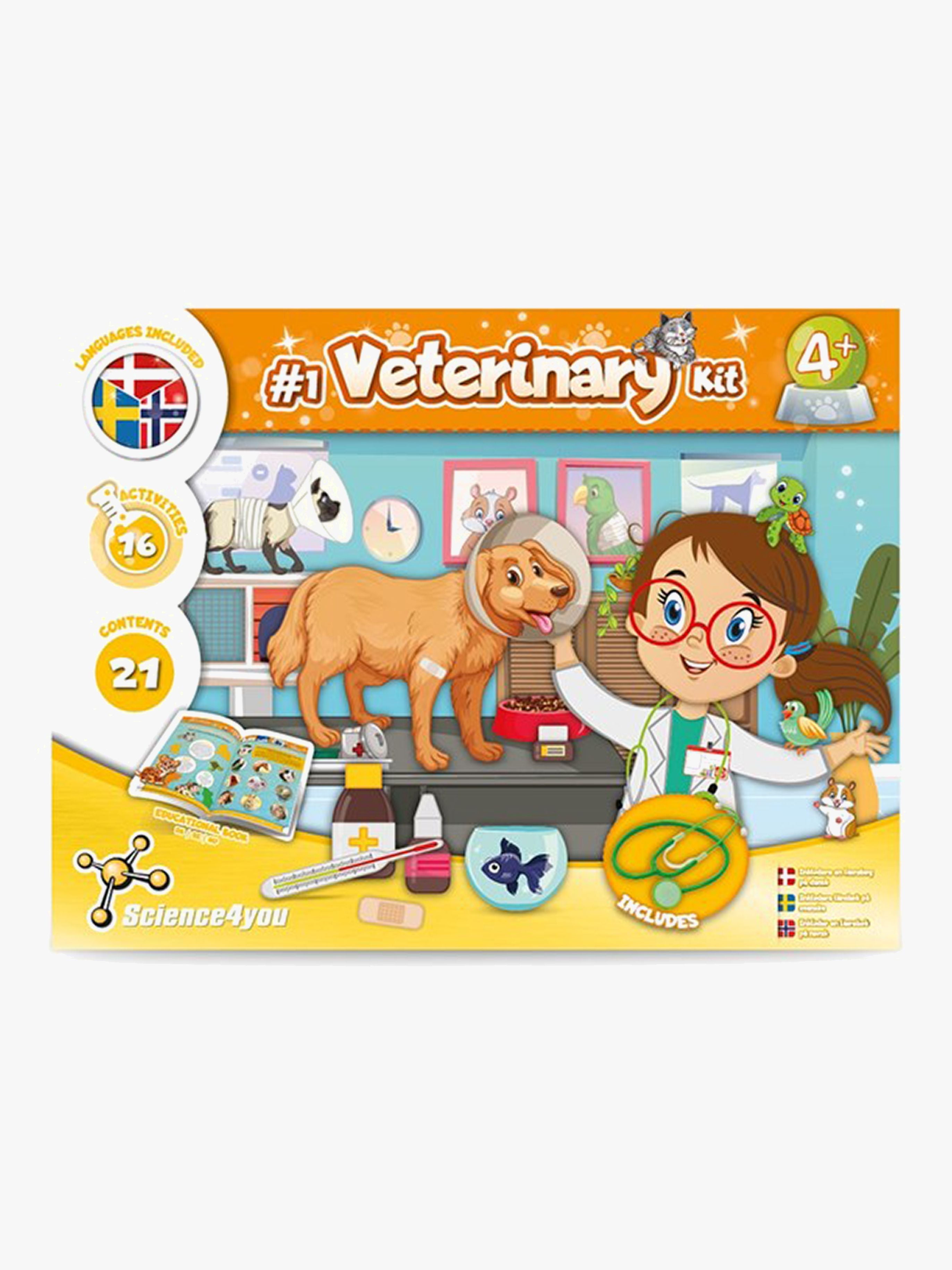 Mit første dyrlægesæt fra Science4you perfekt legetøj til kommende veterinærer, der brænder for dyr. Kom ind i en fantastisk dyrlæge-verden og lær, hvad veterinærer lavet samt, hvilke dyr de behandler. Se, hvordan vi kan holde vores firbenede venner friske og glade. Find ud, hvordan du: Identificerer forskellige typer af kæledyr, hvad de spiser, og hvordan man kan holde dem raske Måler temperaturen og tager blodprøver Studerer et røntgenbillede og applicerer bandage Bager lækre hundekiks Indeholder: Dyrlægekappe Stetoskop Kirurgisk maske Sprøjter Røntgenplade