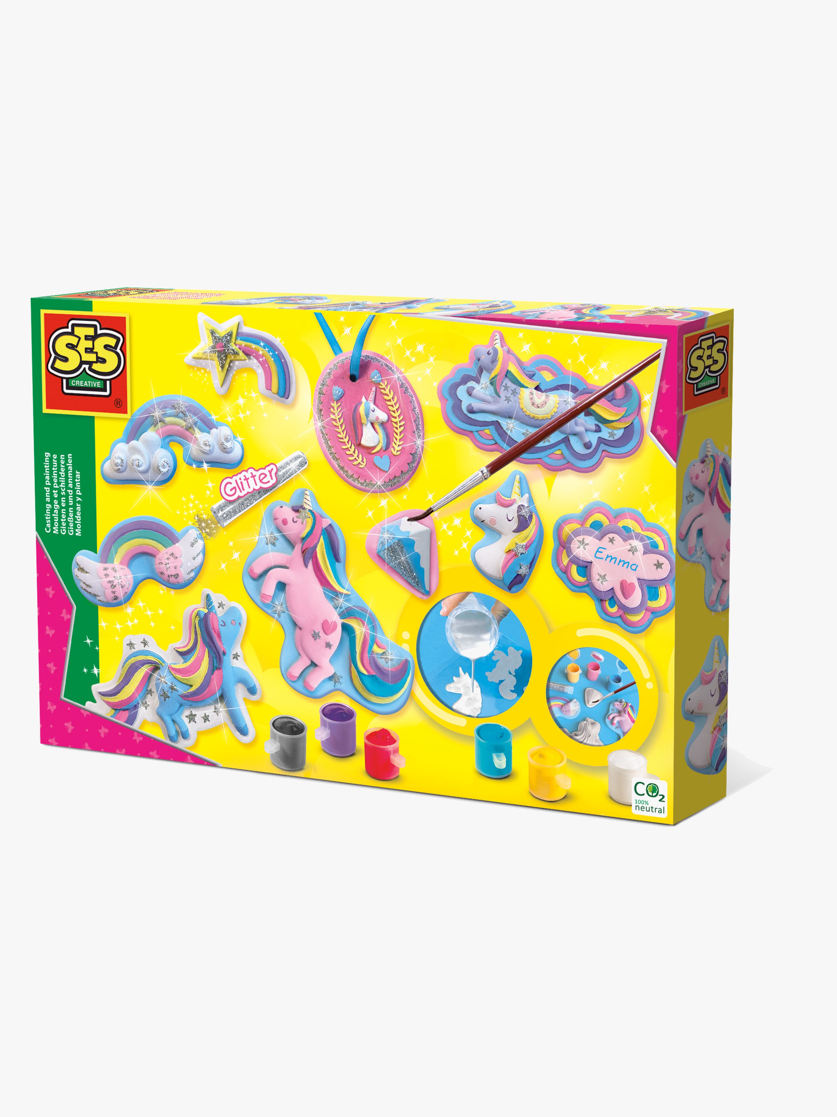 Sjovt gipssæt fra SES. Perfekt til kreative stunder. - Skab søde enhjørningefigurer ved hjælp af gips. - Hæld gipsen i formen og lad den stivne. - Mal figurene som du vil. - Skaberglæde. - Anbefalet alder: Fra 5 år.