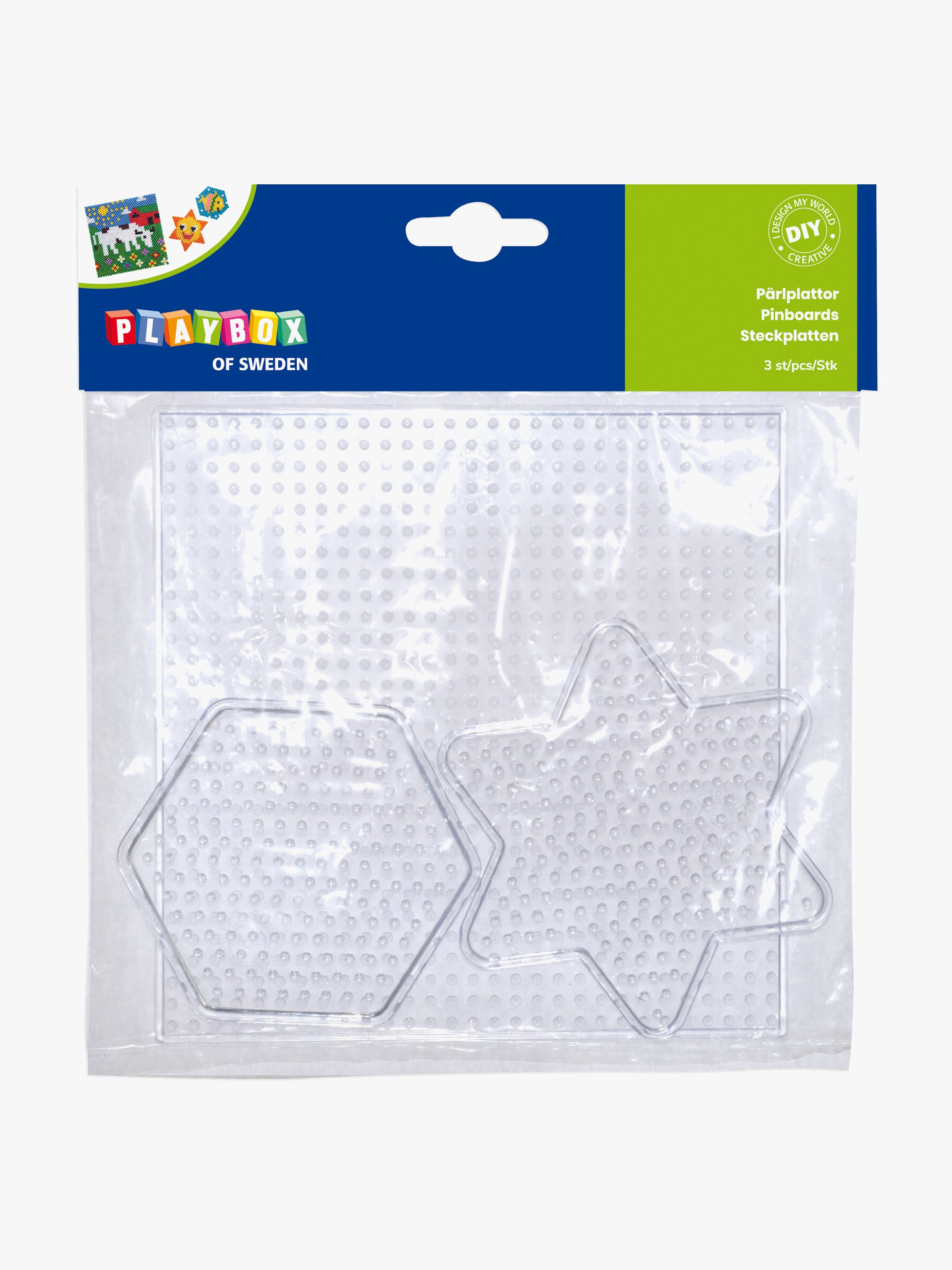 Med disse perleplader fra Playbox kan du skabe fine motiver i forskellige farver. Du får tre perleplader med i forskellige former (heksagon, kvadrat, stjerne) og størrelser. Pladerne passer til miniperler fra Playbox. Anbefalet alder: Fra 5 år.