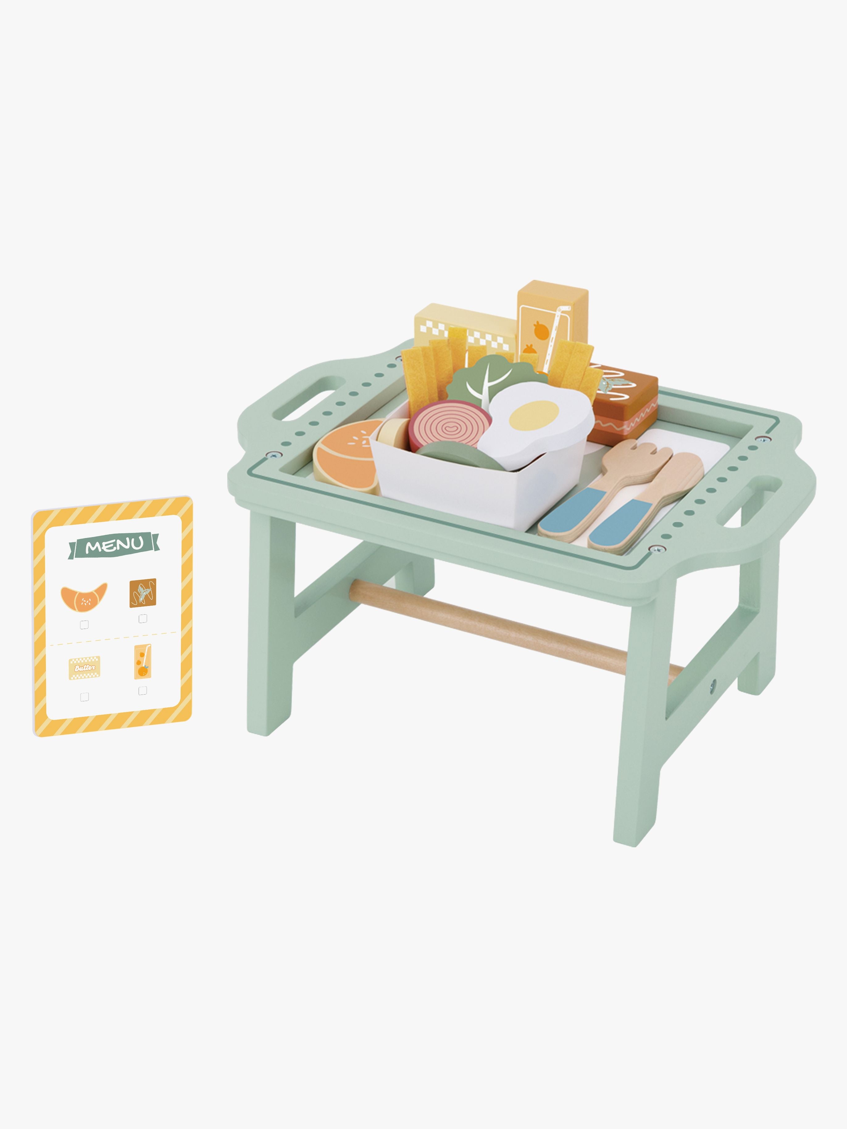 Morgenmadssæt fra Tooky Toy med en praktisk bakke i træ. Det har et sødt bestik. Perfekt til timevis af fantasifuld leg. - Indeholder: 1 bakke, 1 skål, 1 gaffel, 1 legetøjskniv, 1 menukort, 20 fødevarer. - Kun fantasien sætter grænserne. - Detaljeret design. - Rengøres på overfladen med en fugtig klud. - CE-mærket. - Anbefalet alder: Fra 3 år. - Krydsfiner, MDF, PP-plastik.
