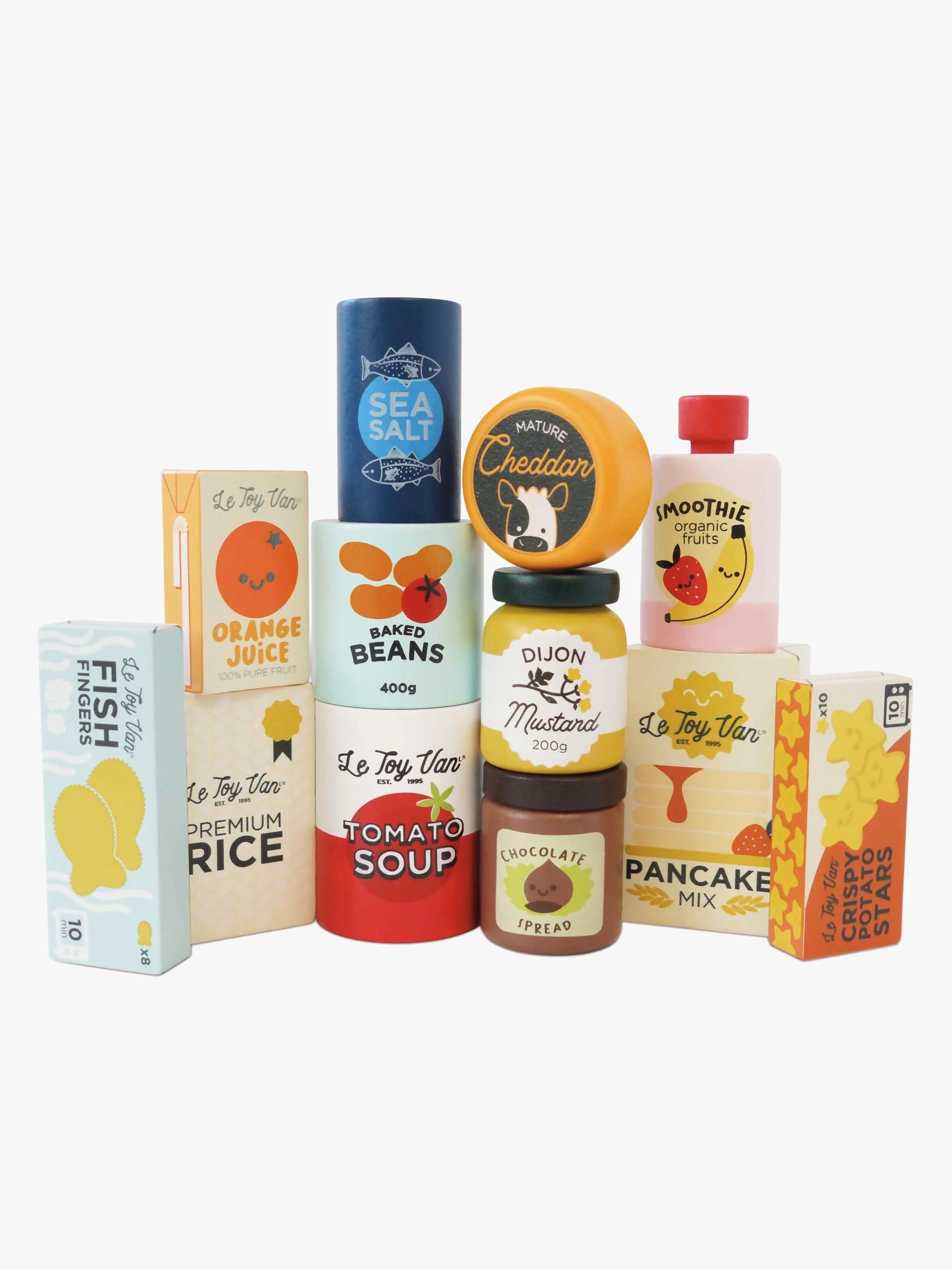 Fødevarer fra Le Toy Van med et sødt design i flotte farver. Perfekte til timevis af fantasifuld leg. - Indeholder: 12 fødevarer. - Brug sættet til at fylde hylderne i din butik! - Detaljeret design. - Udvikler kognitive og finmotoriske færdigheder. - Let at rengøre med en fugtig klud. - CE-mærket. - Anbefalet alder: Fra 3 år. - MDF, tetræ.