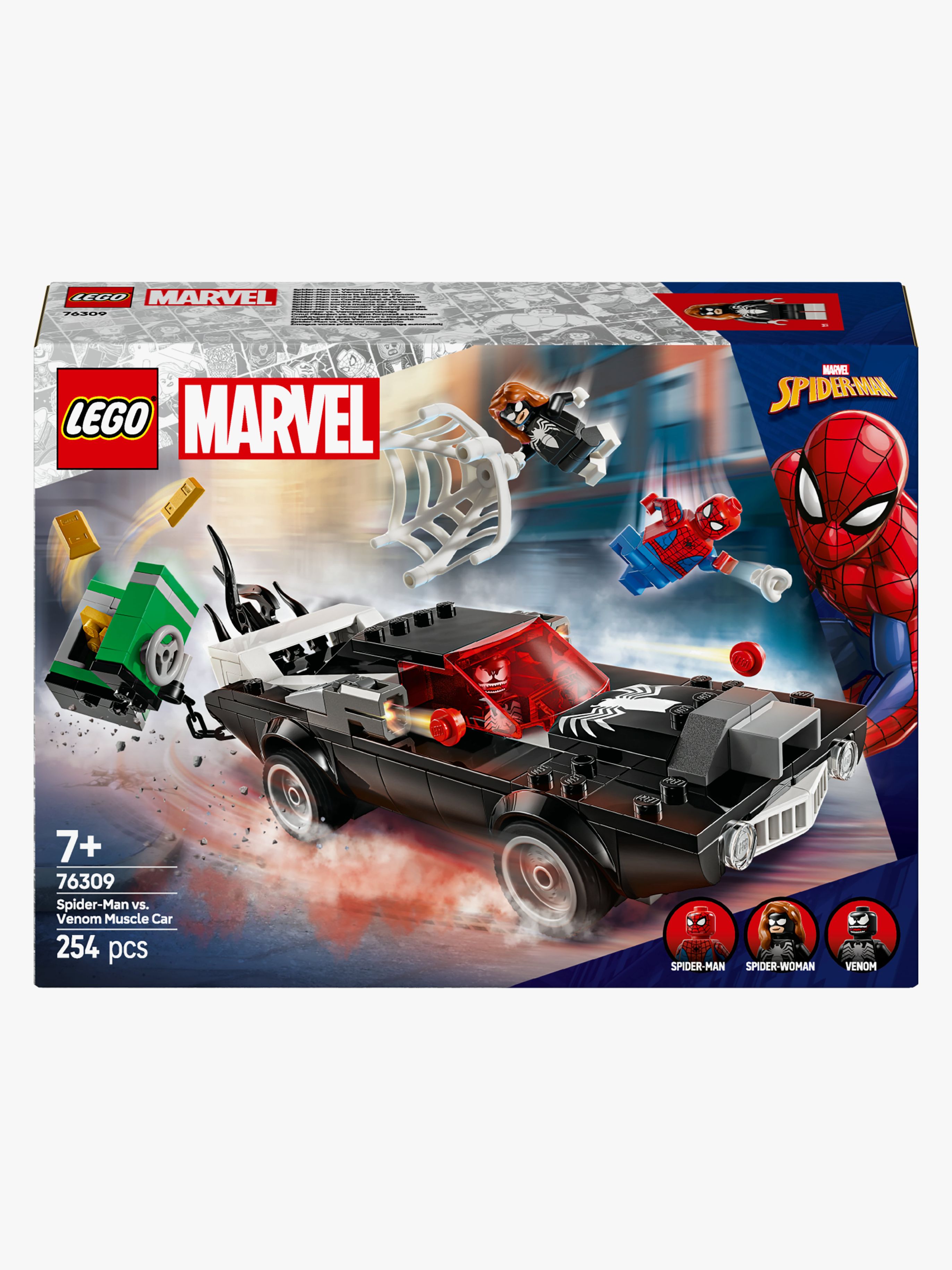 Spider-Man mod Venom-muskelbil 76309 er et byggelegetøj af høj kvalitet til drenge og piger fra 7 år. LEGO bygge- og legesættet er en ideel gave til unge superhelte, især Marvel-fans og børn, der kan lide fysisk og eventyrfyldt legetøj. Byggesættet med Venom-legetøjsbilen omfatter 3 minifigurer: Spider-Man med netskyder, Venom med 4 tentakler og Spider-Woman Julia Carpenter med et fleksibelt spindelvæv, der er stort nok til at fange en skurk. Den venomiserede bil har en skyder på hver side samt en motor og et cockpit, der kan åbnes. Venom kan sidde i bilen, når hans 2 nederste tentakler tages af og bruges til at venomisere bilen endnu mere. Et pengeskab med guldbarrer inspirerer til actionfyldt rolleleg mellem heltene og skurken. Pengeskabet kan slæbes efter bilen, som også har et rum til guldbarrer. For at få endnu mere digitalt sjov kan byggere zoome ind på og dreje modeller i 3D samt holde styr på, hvor langt de er kommet, med den sjove, intuitive LEGO Builder app. LEGO Marvel byggesæt med minifigurer Spider-Man mod Venom-muskelbil Indeholder 3 minifigurer med tilbehør: Spider-Man, Venom og Spider-Woman Venoms bil har 2 skydere, og der kan åbnes ind til både motor og cockpit Børn kan anbringe minifiguren af Venom i bilen ved at fjerne 2 af hans tentakler Spider-Man-byggelegetøjet er en fantastisk gave til børn og fans af superhelte Gør superheltelegen endnu sjovere med mange flere LEGO Marvel sæt sælges separat LEGO Marvel byggesæt giver børn endeløse superhelte-eventyr mellem hænderne Byggelegetøjet med 254 elementer indeholder Venoms bil, der er over 20 cm lang
