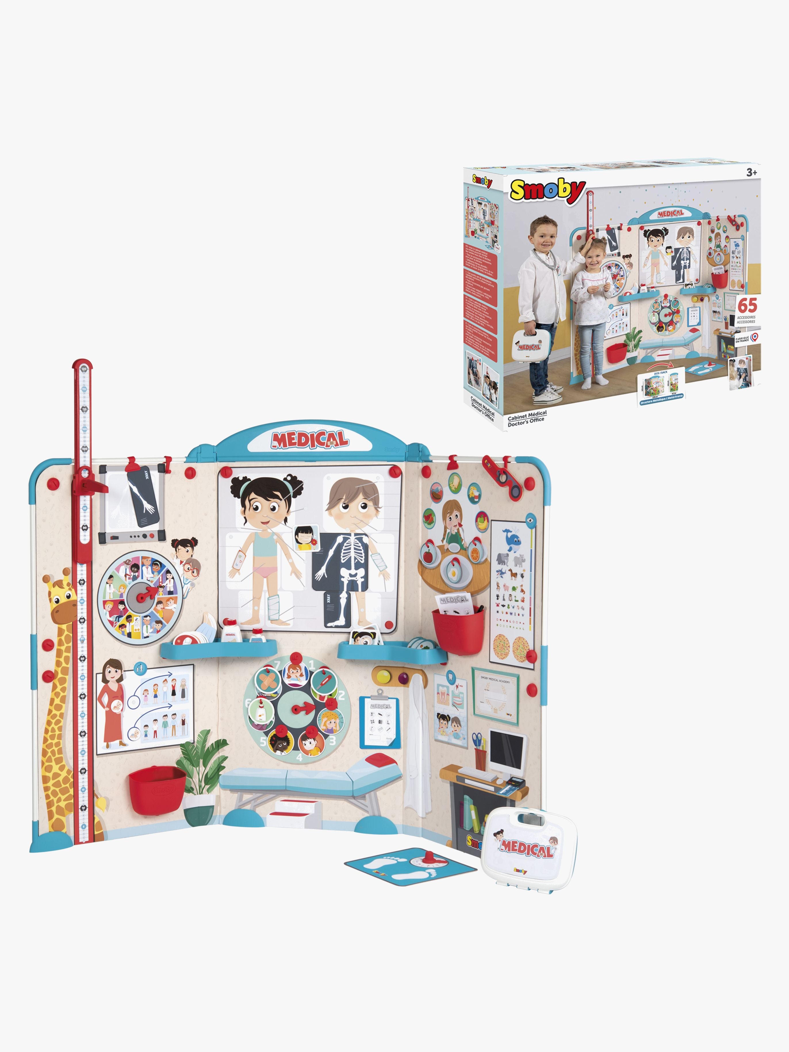 Foldbart lęgekontor fra Smoby med tilbehųr, blandt andet et stetoskop, termometer, receptark og en reflekshammer. Da kontoret er foldbart, er det let at sętte vęk, når barnet ikke leger med det. Perfekt til underholdende rollelege og pędagogiske lege! CE-męrket. Anbefalet alder: Fra 3 år. Plastik, metal, karton.