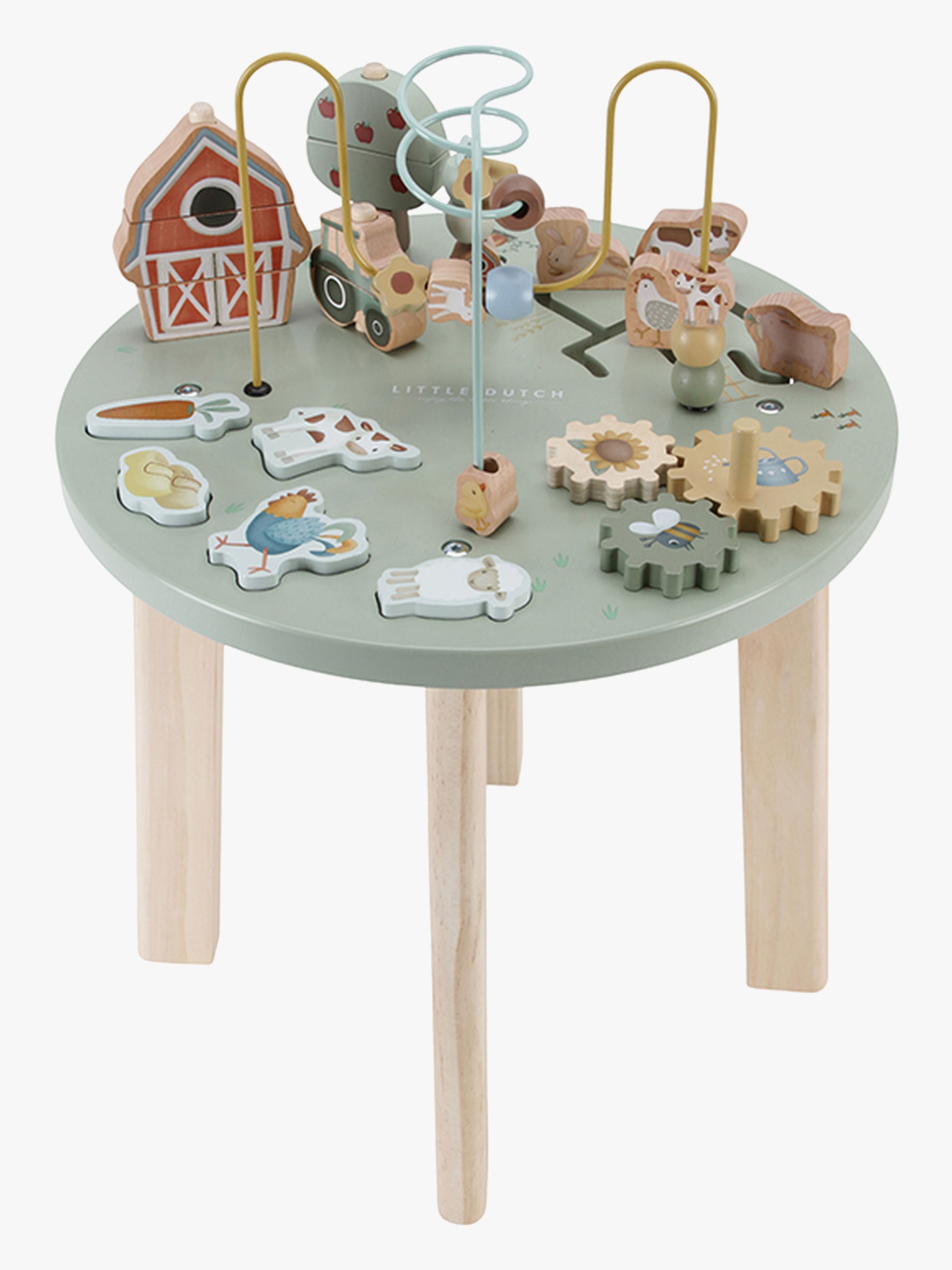 Fint aktivitetsbord fra Little Dutch i flotte farver med mange sjove aktiviteter. Perfekt til træning af dit barns koordination og finmotorik. - 5 aktiviteter at udforske. - Hjul med perler. - Roterende tandhjul. - Puslespil. - Formgenkendelse. - Bondegårdstema. - Udvikler kognitive og finmotoriske færdigheder. - CE-mærket. - Anbefalet alder: Fra 12 måneder. - Træ.