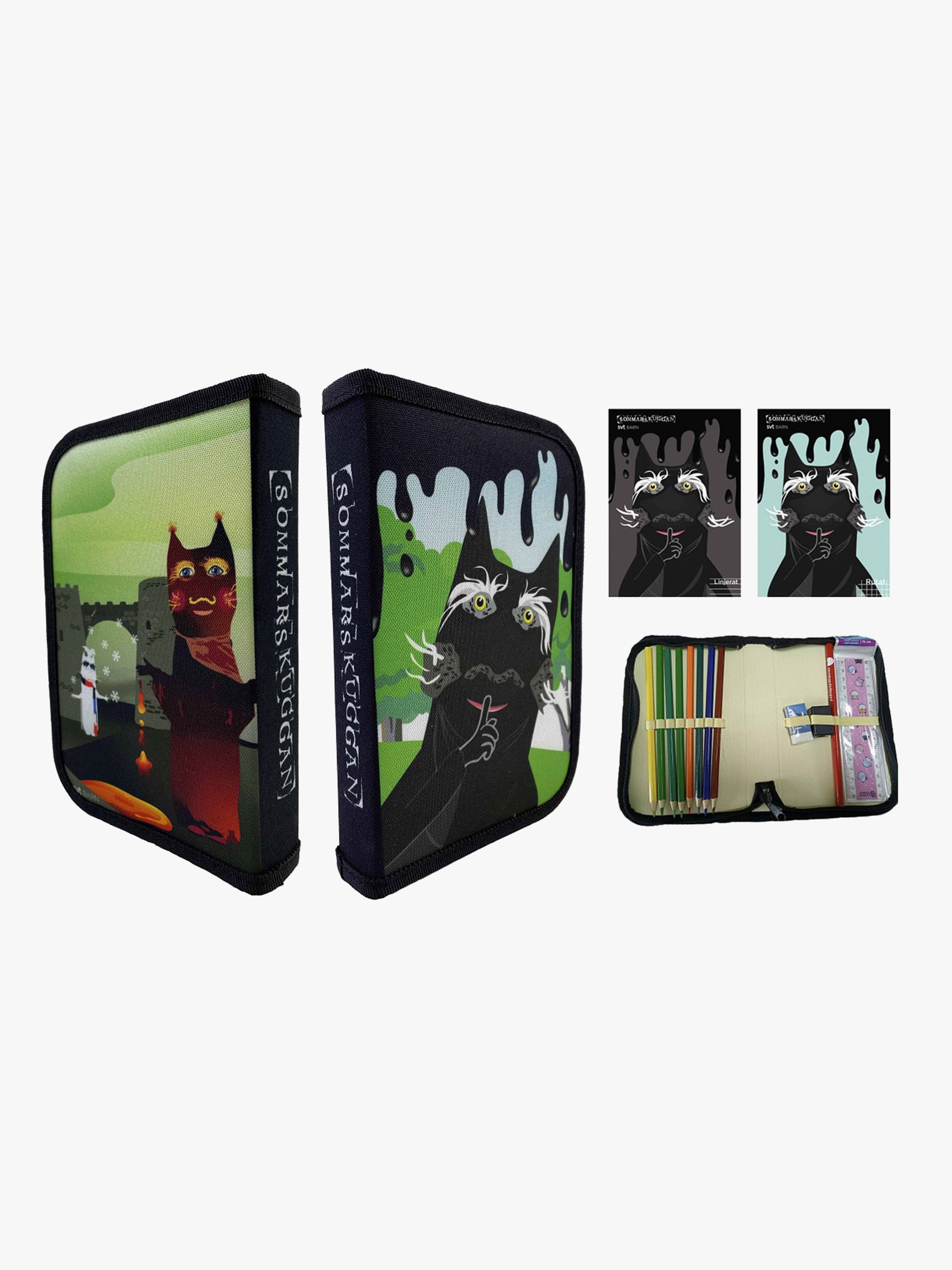 Rummeligt penalhus fra Sommarskuggan. Perfekt til både skole og fritid. - Indeholder: 1 pencilbag, 8 farveblyanter, 1 viskelæder, 1 lineal, 1 blyantspidser, 1 linjeret notesblok, 1 ternet notesblok. - Pyntet med Sommerskyggen, Vinterskyggen og Lavaskyggen. - Anbefalet alder: Fra 4 år. - Nylonstof.