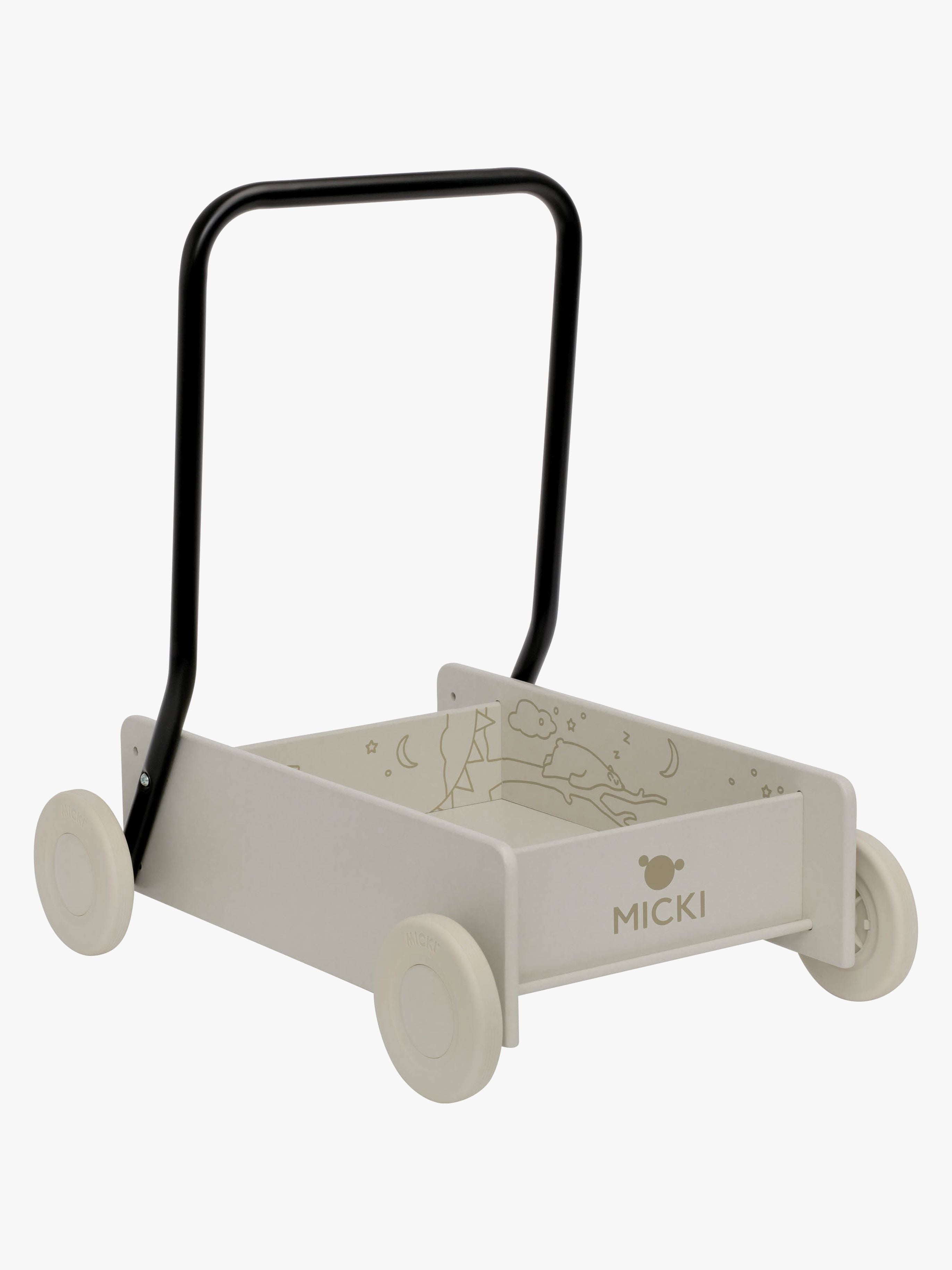 Klassisk gåvogn fra Micki i træ med bremsebare, PVC-frie hjul. Den har et justerbart håndtag. Gåstolen giver stabil og sikker støtte til barnets første skridt. CE-mærket. Anbefalet alder: Fra 6 måneder. Træ, MDF.