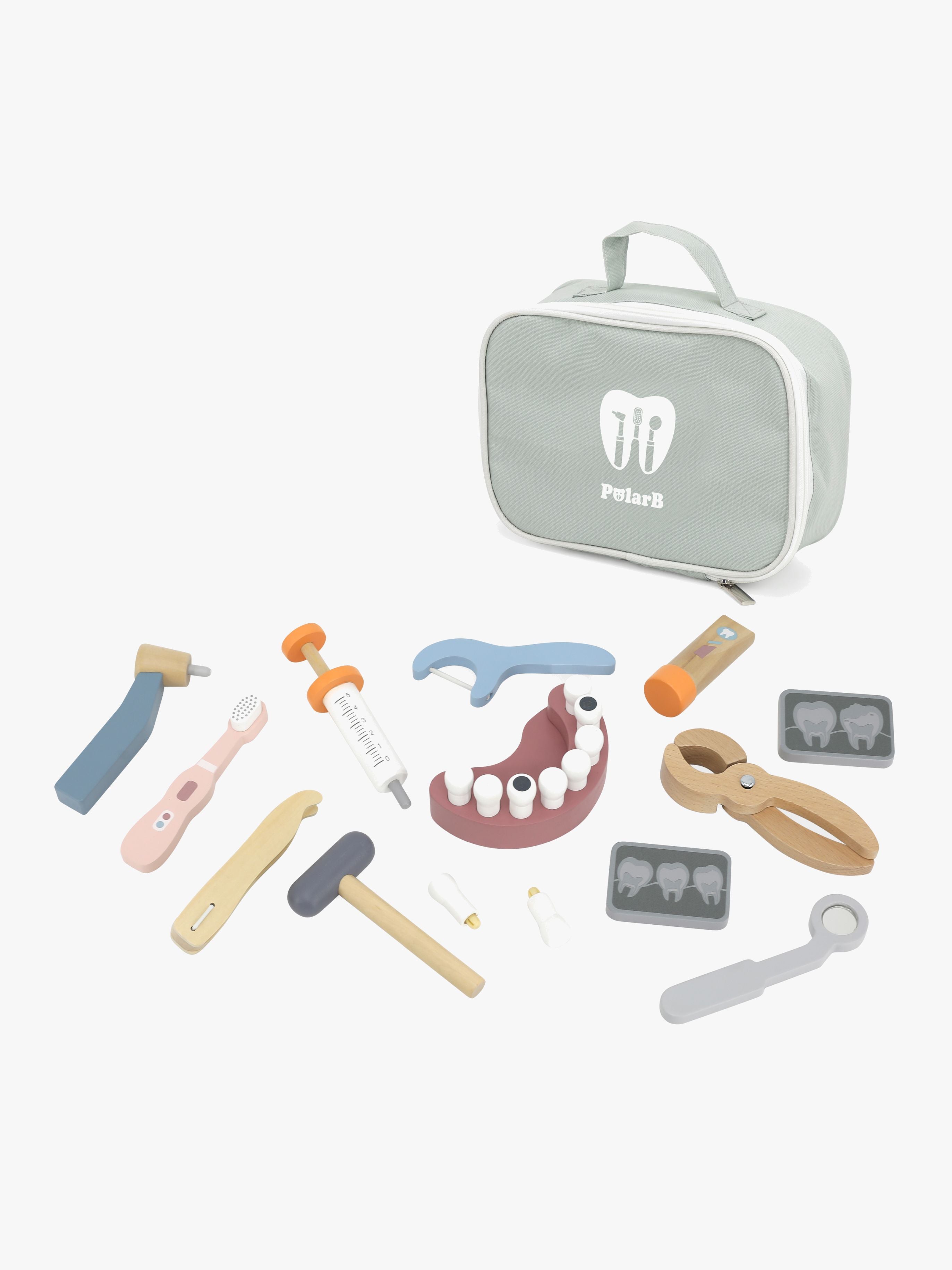 Tandlægesæt fra PolarB med realistisk tilbehør, som dit barn kan udforske. Det har en praktisk opbevaringskasse til at holde styr på det hele. Perfekt til timevis af fantasifuld leg. - Indeholder proteser med udtagelige tænder, 1 tandspejl, 1 sprøjte, 1 tang, 1 tandpastatube, 1 tandbørste, 2 røntgenbilleder, 1 bor, 1 tandtråd og 1 opbevaringskasse. - Udvikler kognitive og finmotoriske færdigheder. - Let at rengøre med en fugtig klud. - CE-mærket. - Anbefalet alder: Fra 3 år. - Træ.