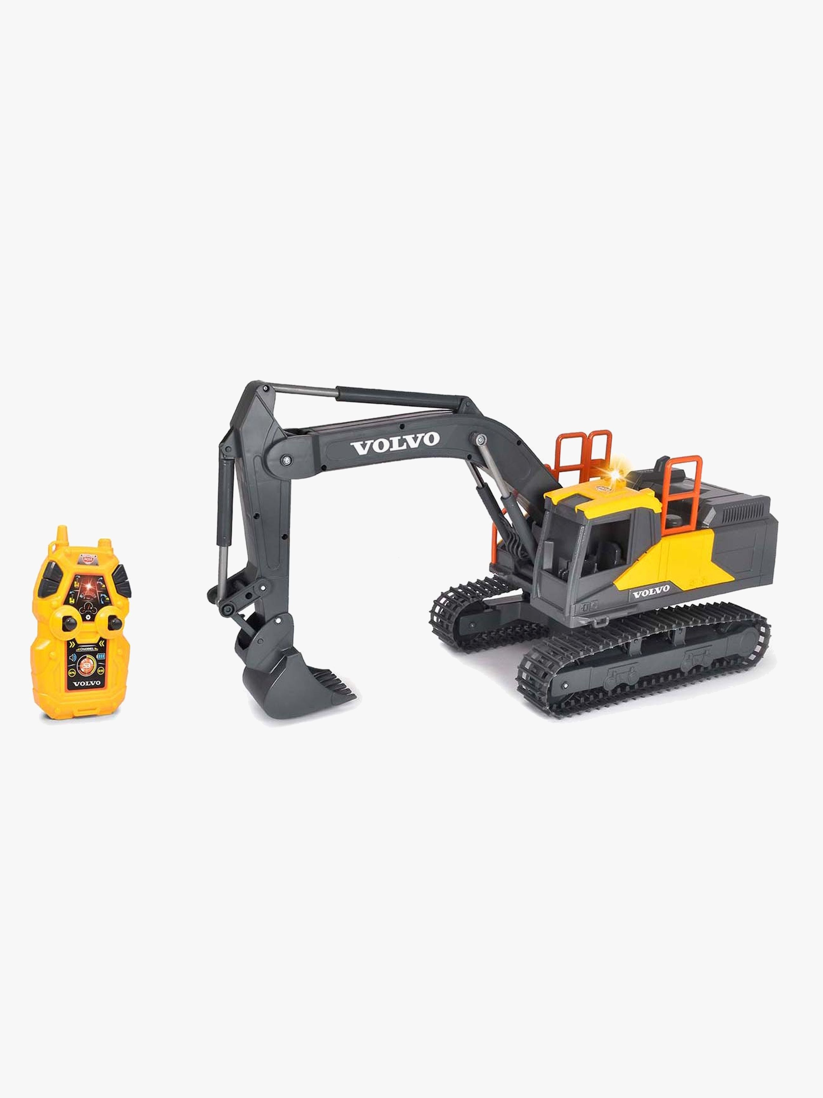 En sej fjernstyret Volvo-gravko fra Dickie Toys. Gravemaskinen har larvefødder, så den kan klare svært terræn, og den styres med den medfølgende fjernkontrol. Førerhuset kan drejes, skovlen kan grave og køretøjet har fuld kørefunktion alt sammen styres via fjernkontrollen. Gravkoen har desuden lyd- og lyseffekter, der gør legen endnu sjovere. Anbefalet alder: Fra 3 år.