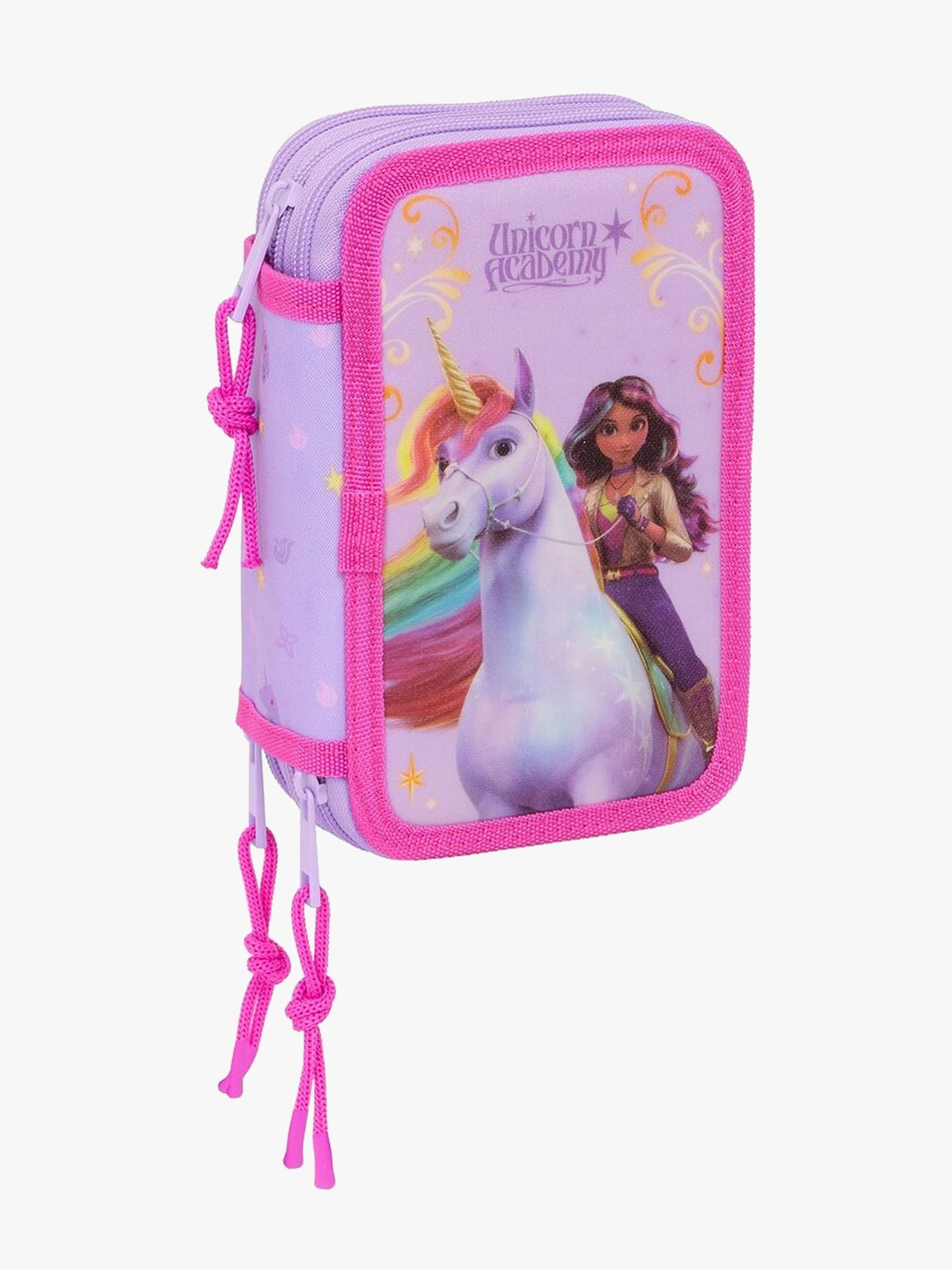 Penalhus med 3 rum fra Unicorn Academy med et komplet skrivesæt. Perfekt til kreative aktiviteter. - Indeholder: 1 penalhus, 1 viskelæder, 1 blyant, 2 kuglepenne, 1 blyantspidser, 2 linealer, 16 farveblyanter, 14 tusser. - Tre rum. - Enhjørningemotiver. - 300D polyester.