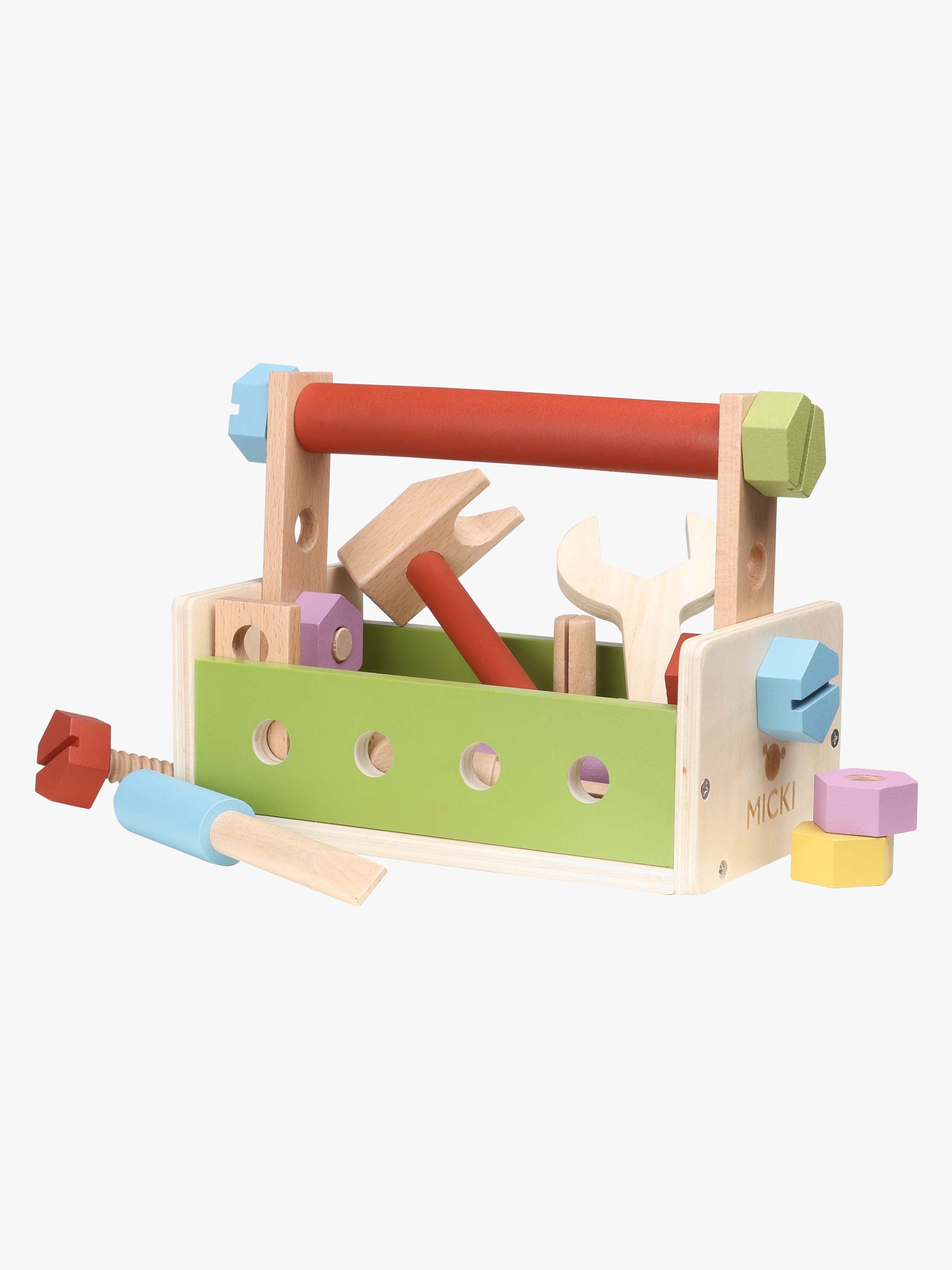 Værktøjskasse fra Micki med 25 farverige værktøjer. Perfekt til timevis af fantasifuld leg. - Indeholder: 1 værktøjskasse, 1 hammer, 1 skruetrækker, 1 skruenøgle, 6 skruer, 6 møtrikker, 3 søm, 4 byggeplader, 2 rundstave. - 3-i-1. - Kan forvandles til en værktøjskasse, arbejdsbænk og robot. - 25 dele. - Farverigt design. - CE-mærket. - Anbefalet alder: Fra 3 år. - Træ.