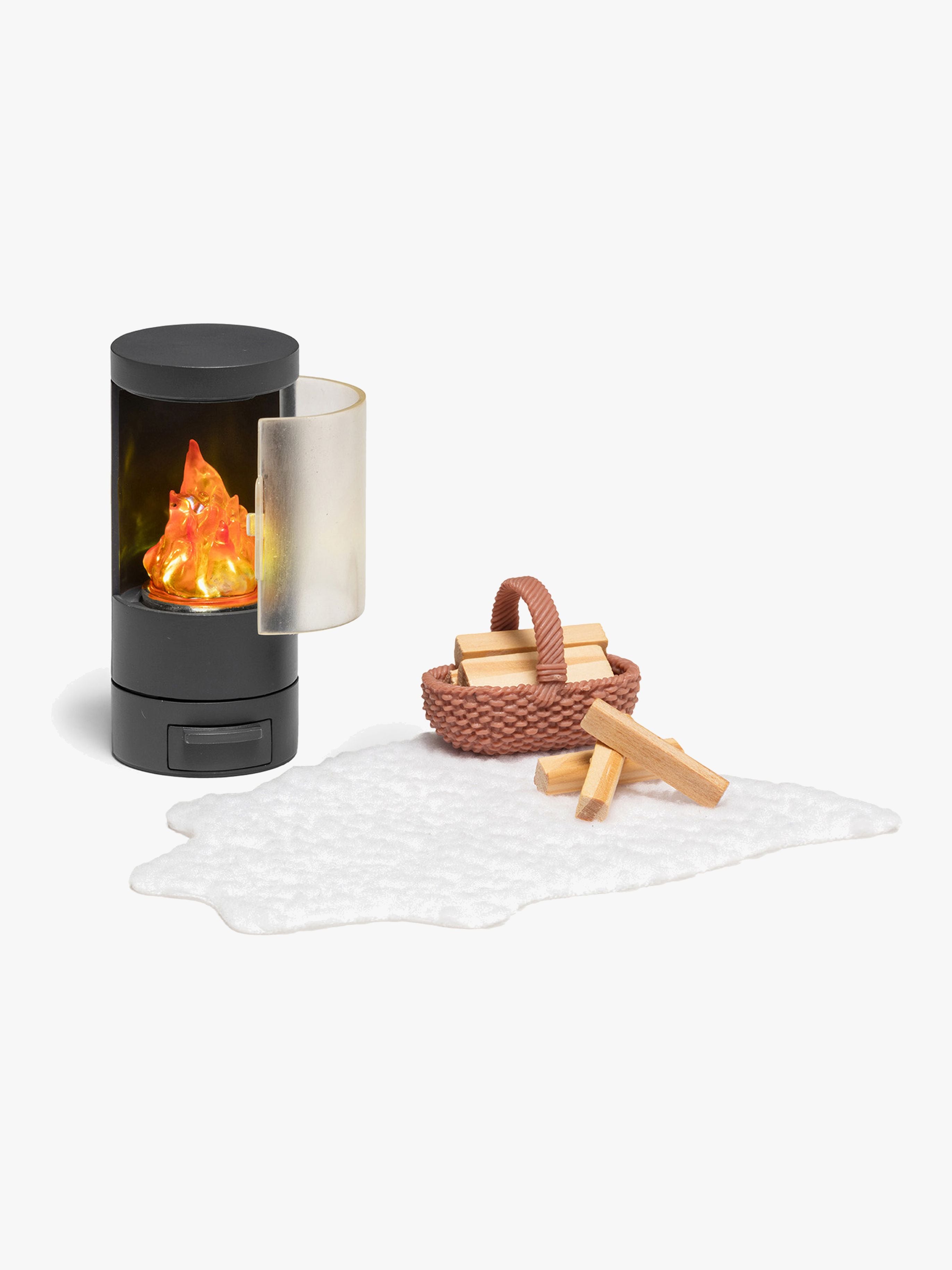 Elegant dukkehustilbehør fra Lundby. Dette Lundby-sæt indeholder en moderne pejs, et fåreskindstæppe og en kurv af træ. Pejsen drives af et 2032 batteri og ilden tændes ved et tryk på en knap. Den har også en udtræksskuffe og en låge, der kan åbnes. CE-mærket. Anbefalet alder: Fra 4 år. Batteri: 1 x CR2032 (medfølger ikke).