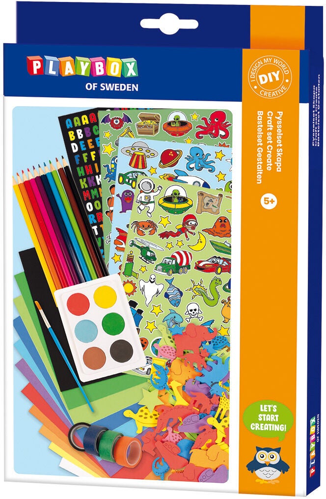 Kreasæt fra Playbox med en masse materialer til at være kreativ med. Det har klistermærker og farver. Kreasættet har papirark og figurer, som kan kombineres på mange kreative måder. Perfekt til mange timers kreativ leg. CE-mærket. Indeholder: 4 klistermærkeark, 4 taperuller, 20 fremstillet af papir, 10 farvepenne, 50 figurer, 1 farvepalet, 1 pensel. Anbefalet alder: Fra 5 år.