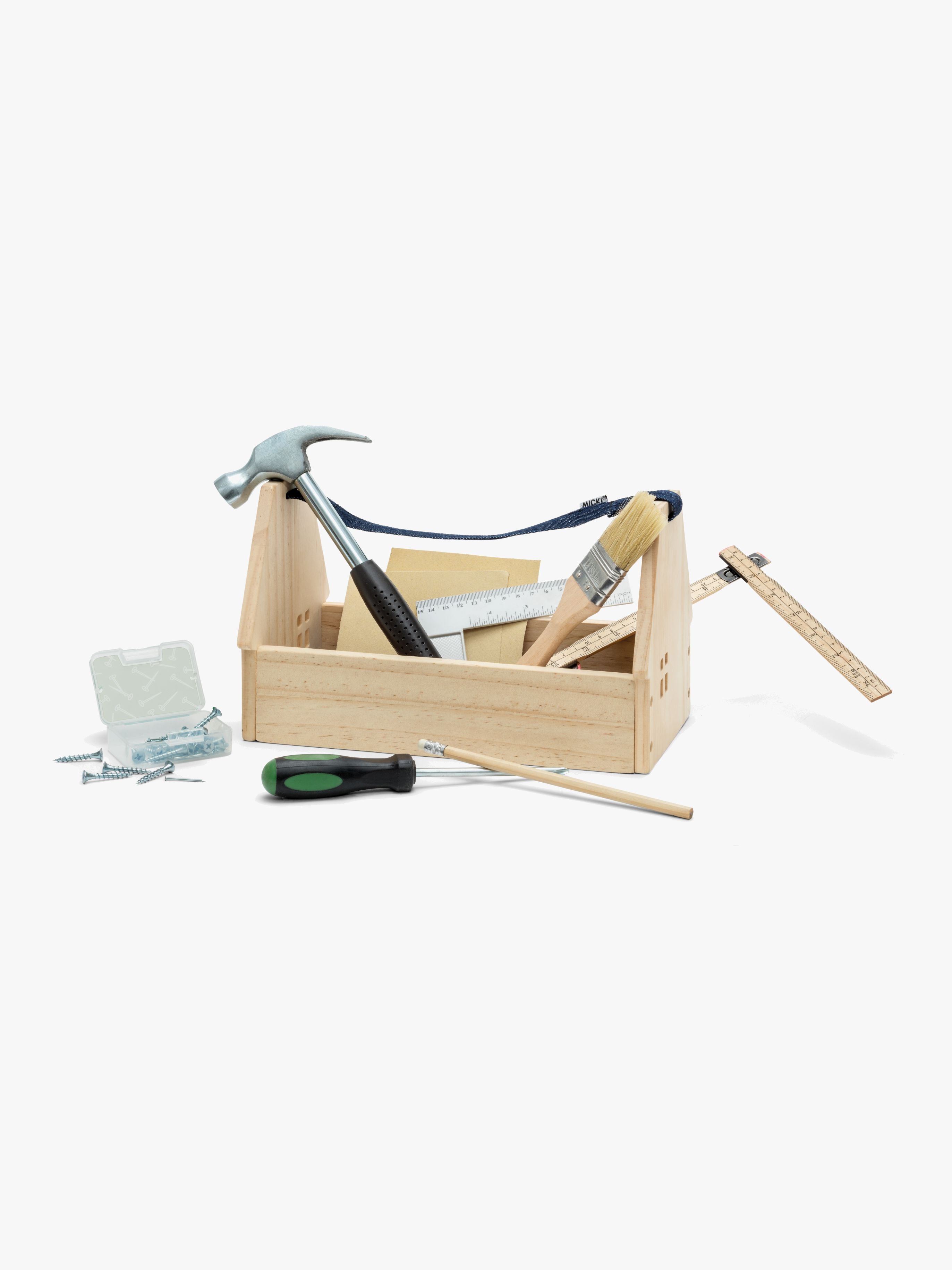 En værktøjskasse fra Micki med børneværktøj perfekt til alle de små tømrere! Værktøjskassen er fremstillet af træ og udformet som et hus, med håndtag af cowboystof. Med værktøjskassen får du: hammer, skruetrækker, vinkelmåler, pensel, tommestok, blyant, sandpapir og en pakke med søm og skruer. Værktøjet er småt, så det kan bruges af små hænder. Anbefalet alder: Fra 3 år