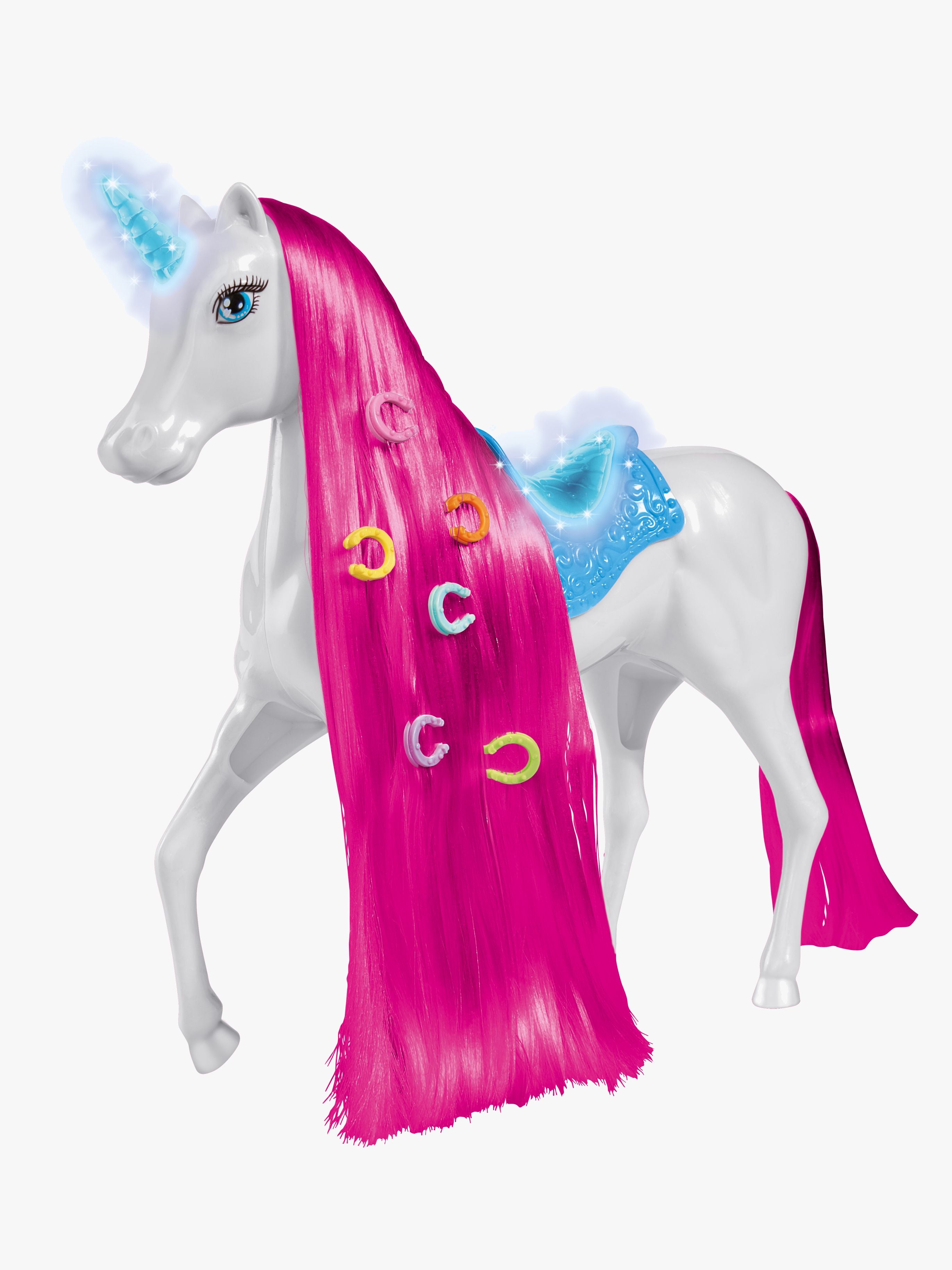 Glitrende enhjørning fra Steffie Love med en pink manke med hårspænder. Når du trykker sadlen ned, begynder sadlen og hornet at skinne eventyrligt. Perfekt til en magisk legestund. Passer til dukker op til 29 cm. CE-mærket. Anbefalet alder: Fra 3 år.