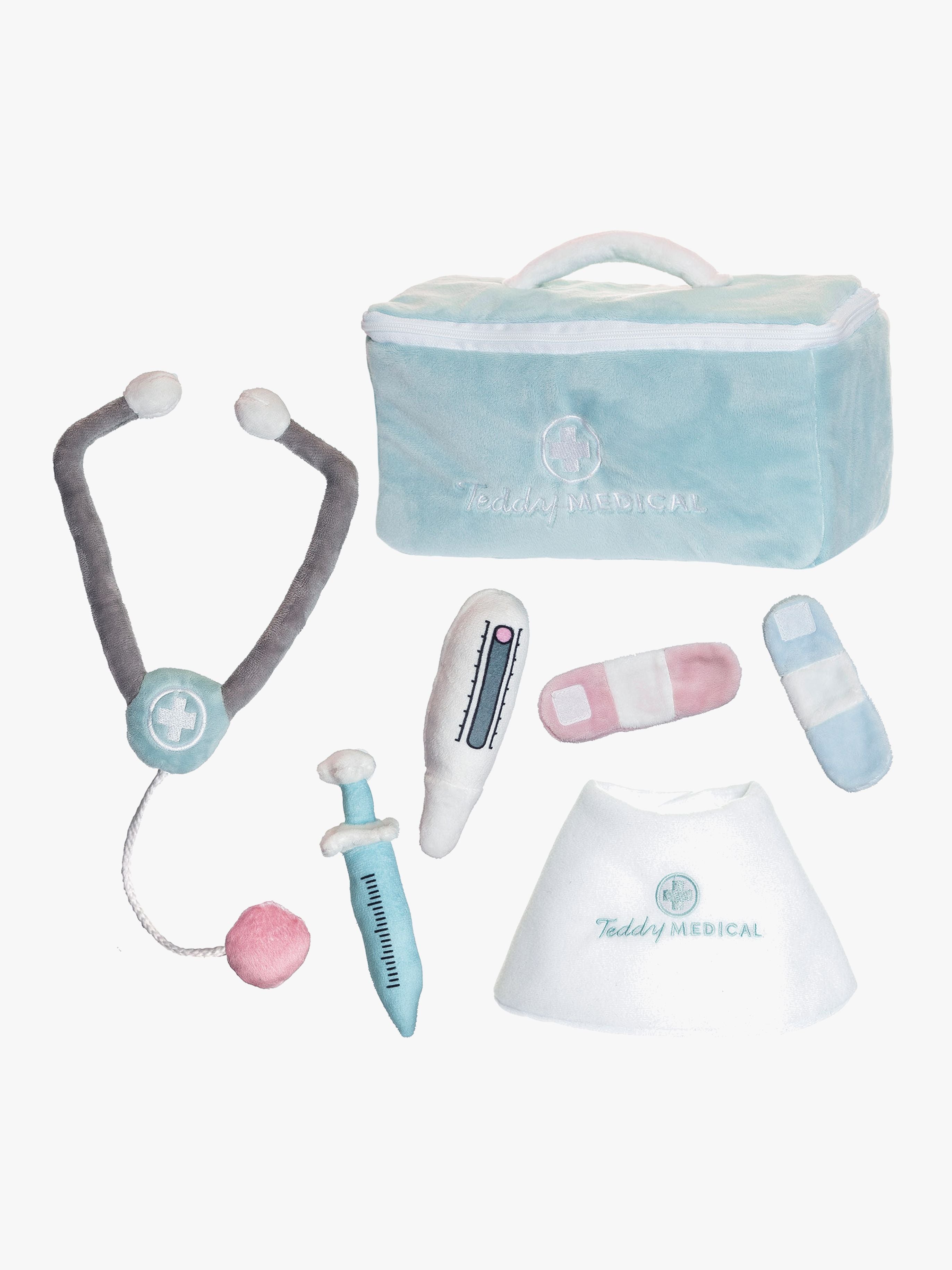 Blųd lęgetaske fra Teddykompaniet. Perfekt til timevis af fantasifuld leg. - 6 dele. - Indeholder: 1 , 1 stetoskop, 1 kanyle, 1 termometer, 1 bandage, 1 krave, 1 opbevaringskasse. - CE-męrket. - Anbefalet alder: Fra nyfųdt. - Plys.