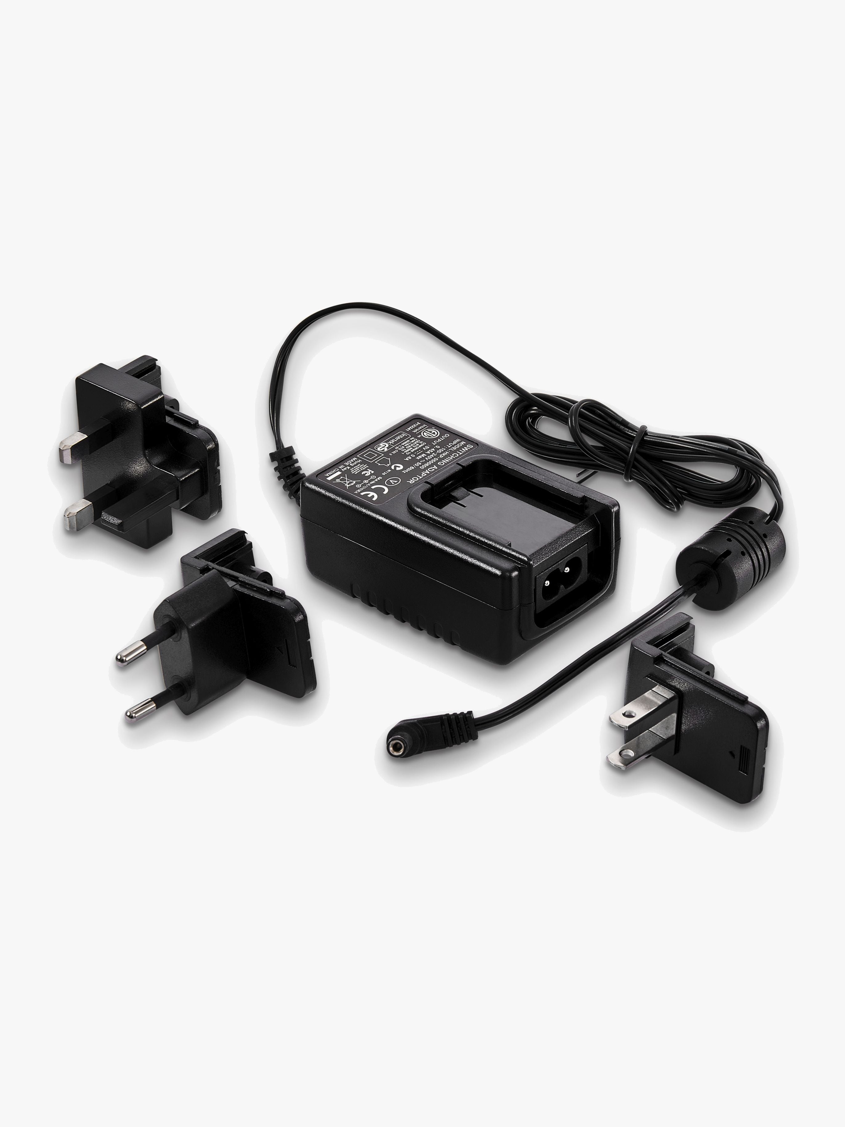 Strømadapter fra Millennium, der er kompatibel med stikkontakter i EU, Storbritannien og USA.