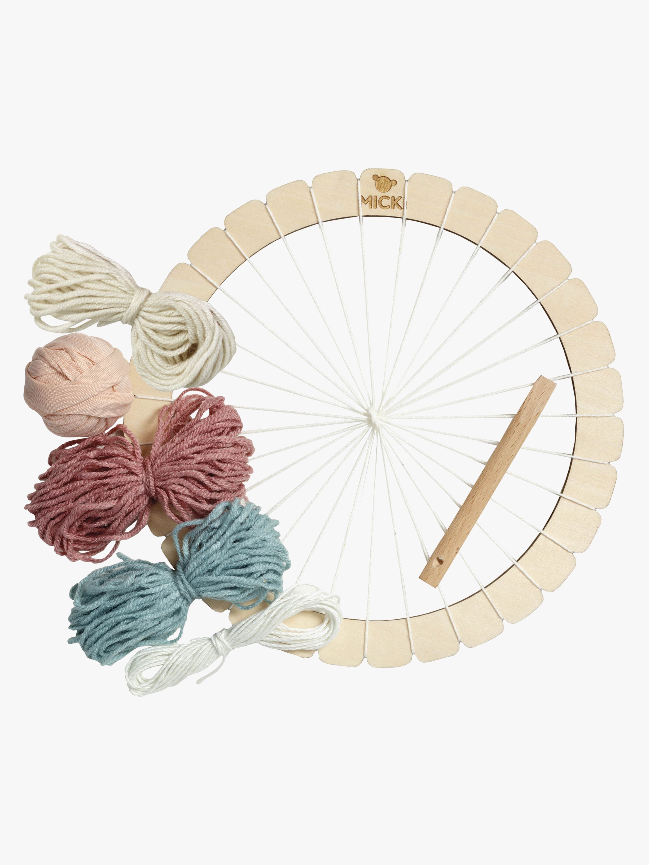 Rund, klassisk væveramme fra Micki med garn i 3 farver. Med væverammen kan du skabe søde duge eller flotte tæpper til dukkehuset. Rammen er trådet og klar i til brug, så du kan begynde at væve med det samme.