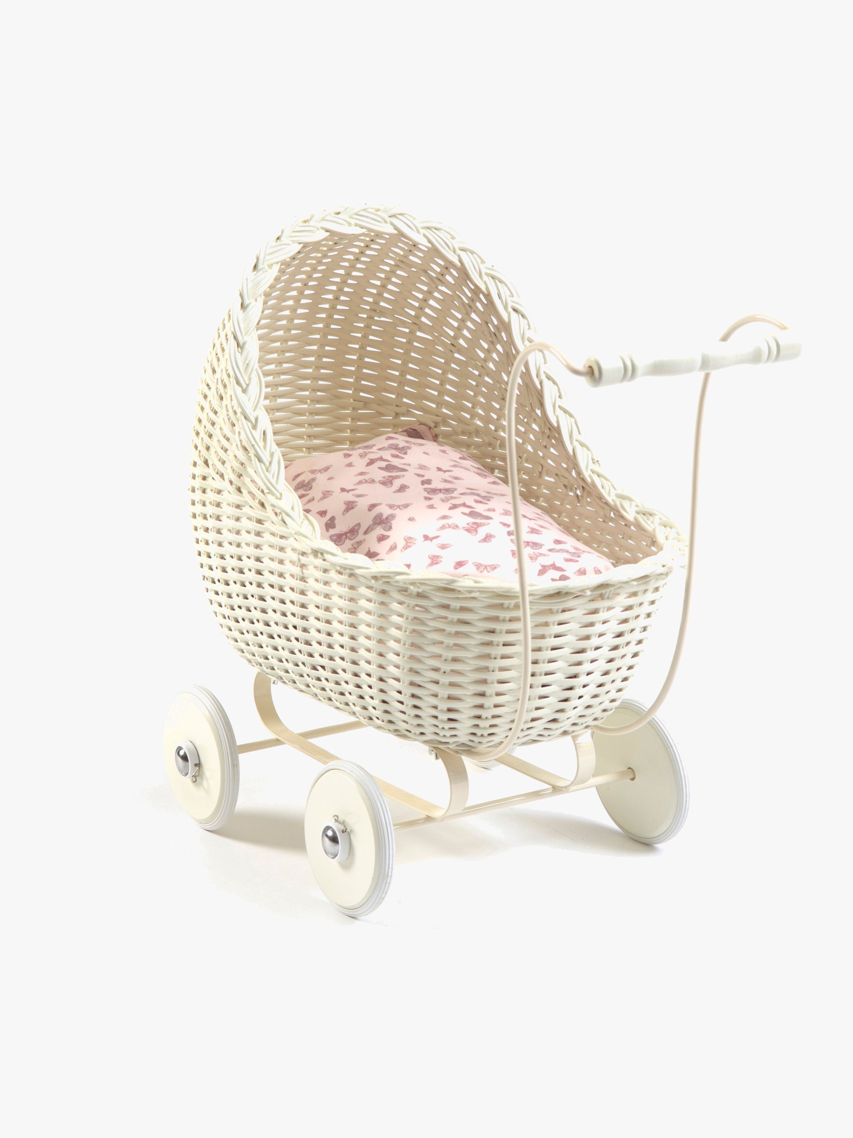 Dukkevogn fra Smallstuff en superfin og charmerende dukkevogn i romantisk fletværk. Dukkevognen kommer med en blød bomuldsmadras, så dukker og bamser ligger behageligt. Smallstuffs Dukkevogne fås i flere forskellige farver. Specifikationer: Mål: ca 46 x 30 x 49 cm // Madrasmål: ca 38 cm. Materiale: Flet, træ og metal. Bemærk: Kun dukkevognen indgår. Sengetøj m.m. købes separat.