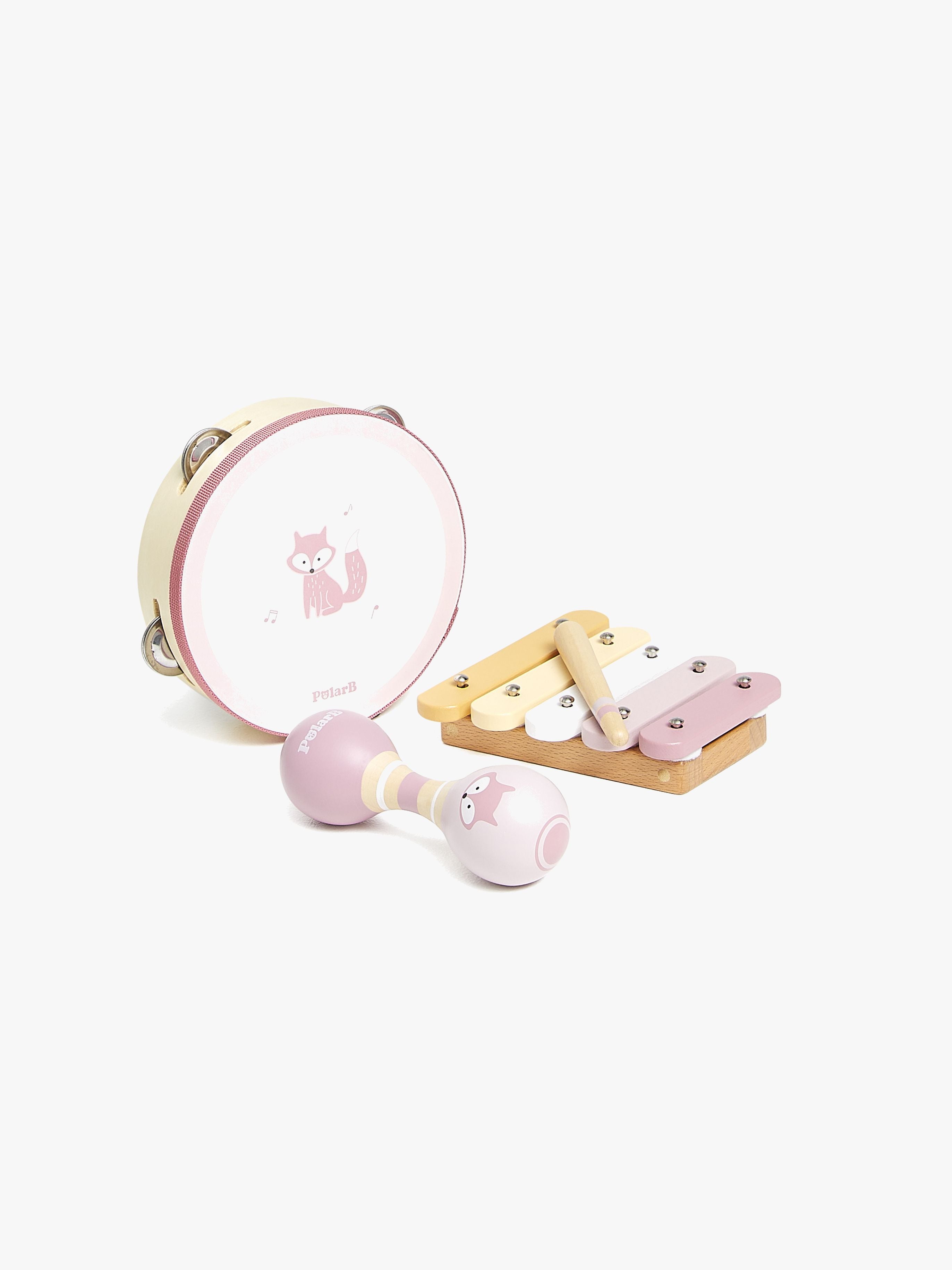 Instrumentsæt fra PolarB. Sættet indeholder en tamburin, en dobbelt maracas og en xylofon med trommestik. Perfekt sæt, som dit barn kan slippe sin fantasi løs med eller spille sine favorittoner med! Det hjælper også dit barn med at udvikle sin musikalitet og lydgenkendelse. - CE-mærket. - Træ.