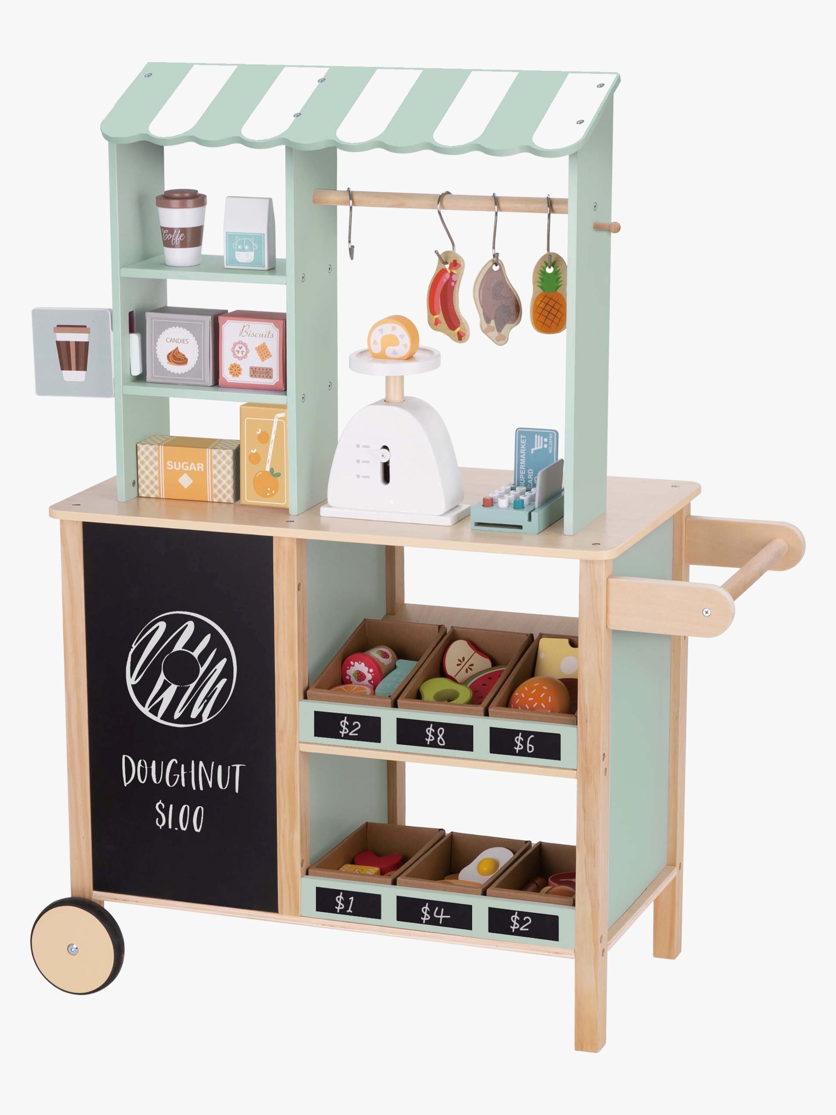 Købmandsbutik fra Tooky Toy med en masse sjovt tilbehør at fylde butikken med. Perfekt til timevis af fantasifuld leg. - Indeholder: 1 købmandsbutik, 1 kasseapparat, 1 køkkenvægt, 6 bokse, 1 skilt, 1 sæt med legetøjspenge, 6 kvitteringer, 31 legemad. - Retrodesign. - Legemad. - Ovn, der kan åbnes. - To hjul for let flytning mellem rum. - Kun fantasien sætter grænserne. - Giftfri maling. - CE-mærket. - Anbefalet alder: Fra 3 år. - Krydsfiner, plastik, metal, papir.