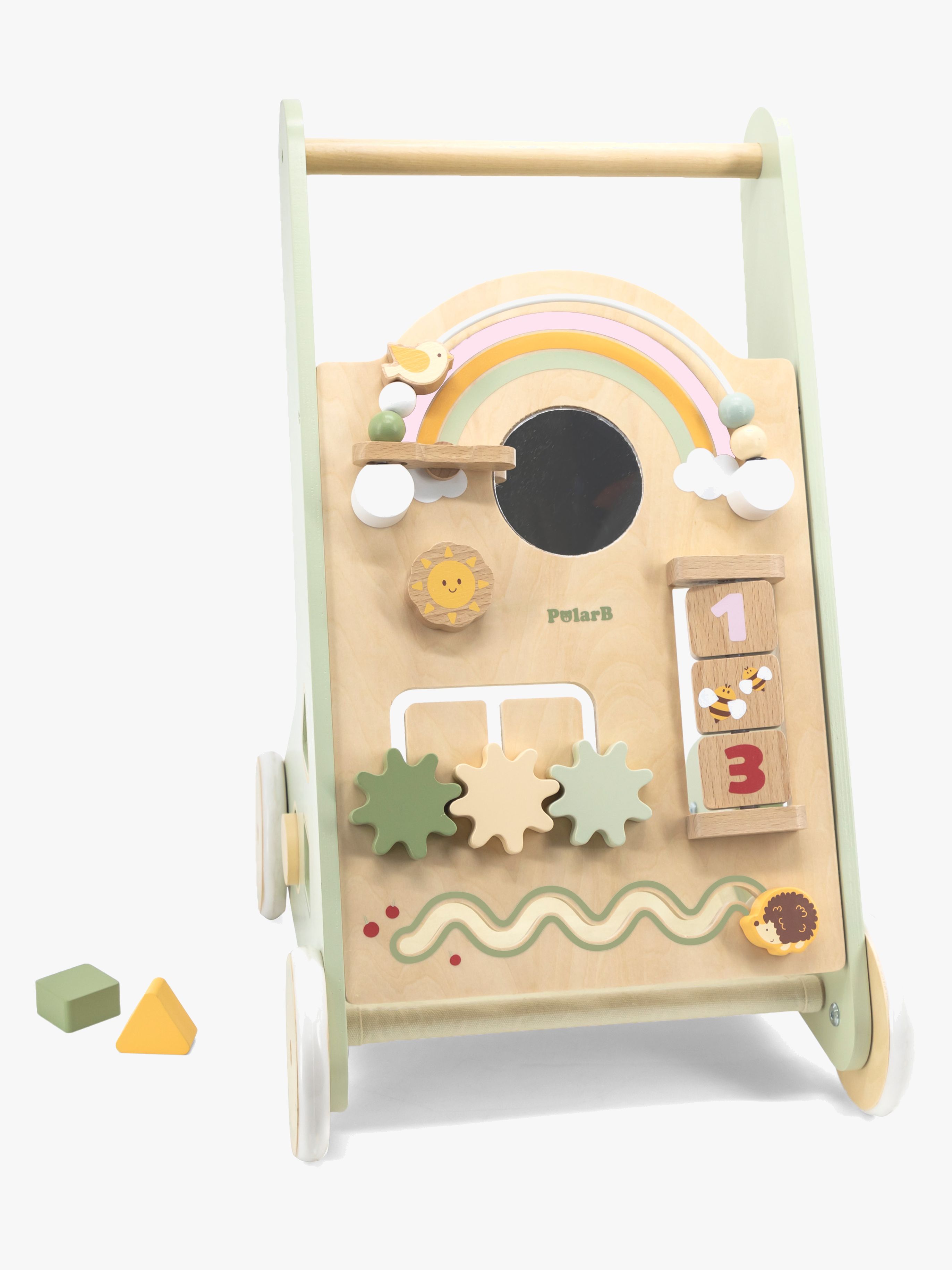 Fin gåvogn fra PolarB med mange forskellige aktiviteter. Perfekt, når den lille skal lære at gå. - 8 aktiviteter. - Puttekasse. - Tandhjul. - Xylofon. - Perler på stang. - Spejl. - Rangle. - Perfekt til træning af former og farver, hånd-øje-koordination og finmotorik. - CE-mærket. - Anbefalet alder: Fra 12 måneder. - Krydsfiner, MDF, træ.