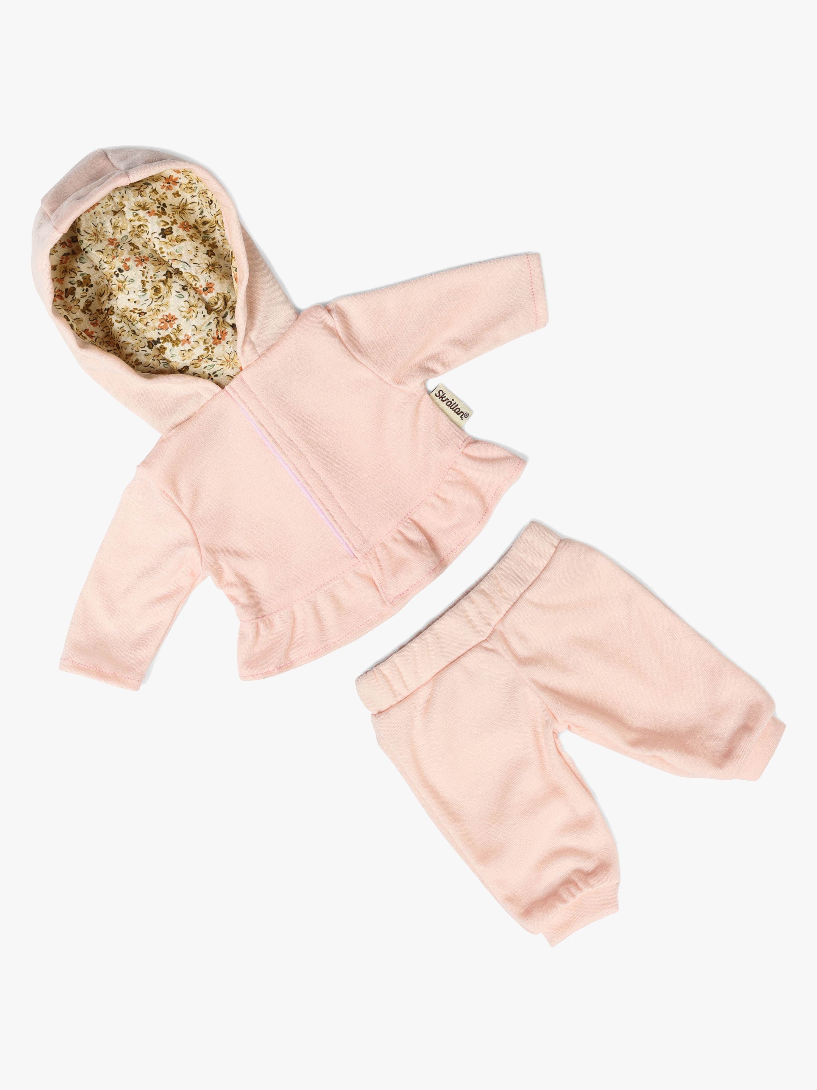 Joggingsæt fra Skrållan med et lyserødt, behageligt design. Det har en blød hættetrøje med flæsedetaljer og en hætte med et blomstermønster og matchende bukser. Perfekt til timevis af fantasifuld leg. Passer til dukker på 36-40 cm. CE-mærket. Anbefalet alder: Fra 3 år. Polyester.