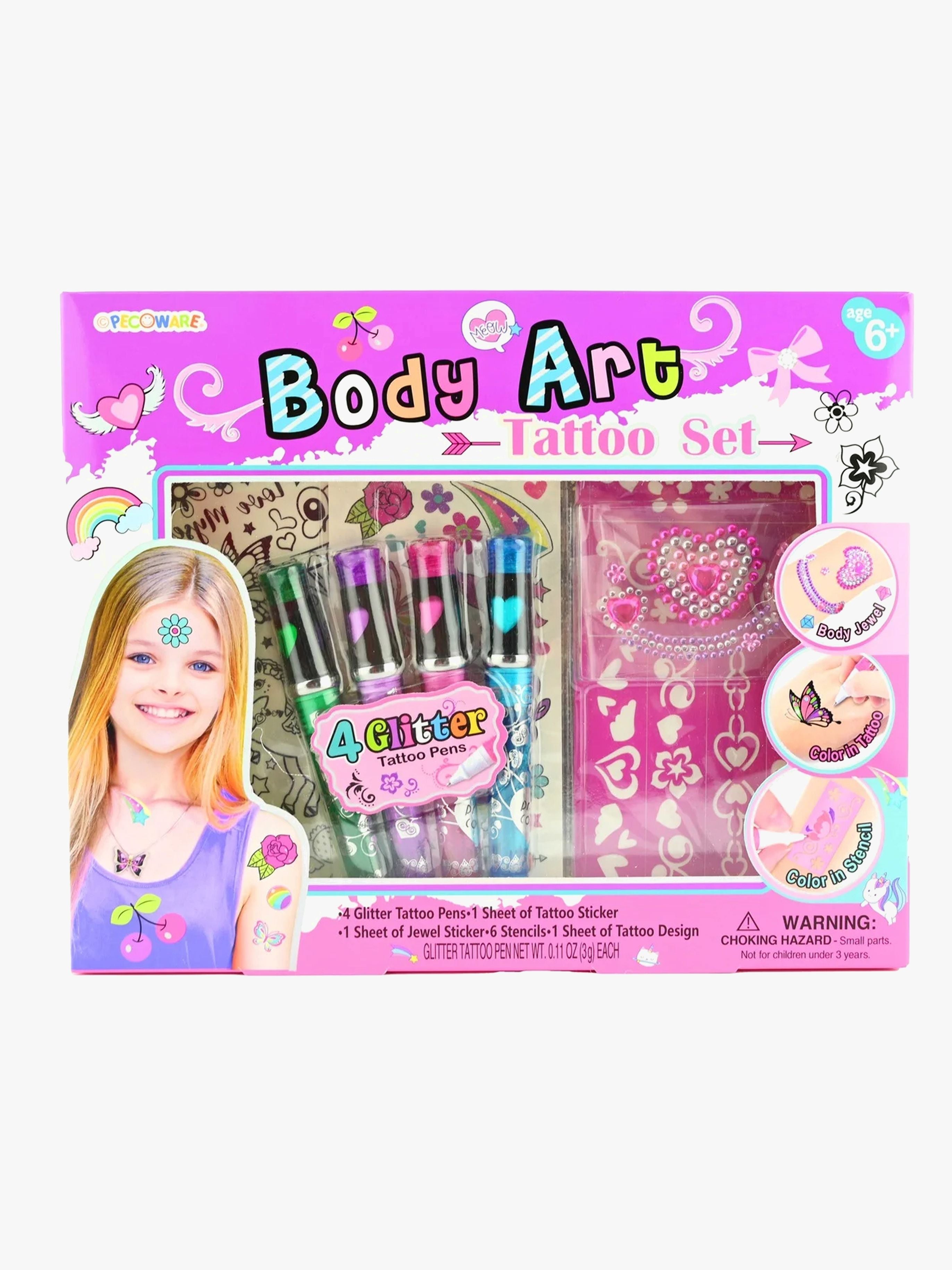 Sjovt tatoveringssæt fra Robetoy med tatoveringsark. Perfekt til kreative aktiviteter. - Indeholder: 4 glitter-tatoveringspenne, 1 tatoveringsklistermærkeark, 1 juvelklistermærkeark, 6 stenciler, 1 tatoveringsdesignark. - Egnet til både krops- og ansigtsmaling. - Slip kreativiteten løs. - CE-mærket. - Anbefalet alder: Fra 6 år. - Plastik.