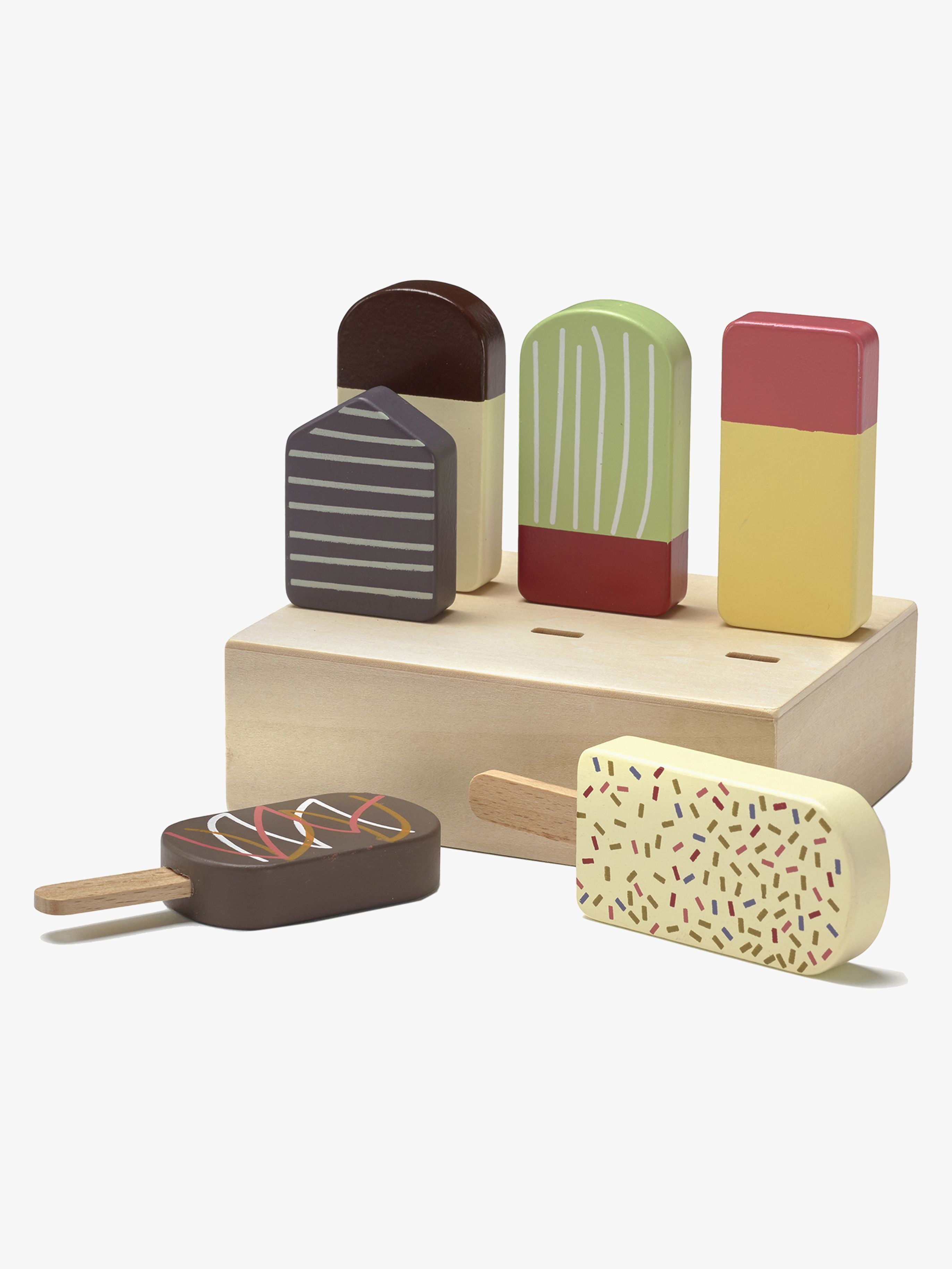 Sjove ispinde af træ fra Kids Concept. I dette sæt får du seks ispinde, et isstativ og en kasse til at lægge dem i. Perfekte til at lege butik eller skovtur med!