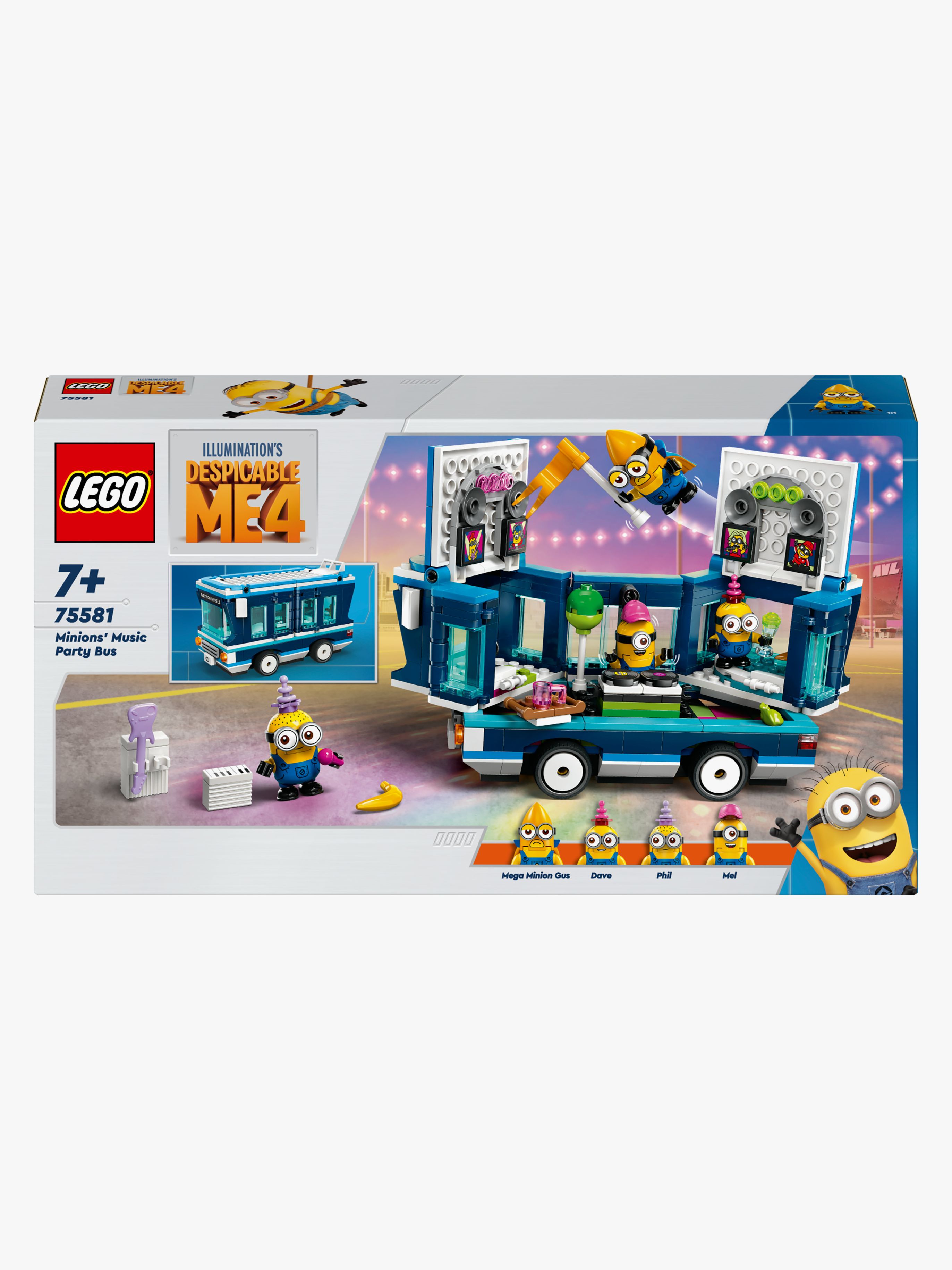 Giv fans af Minions-legetøj og børn med en passion for køretøjer 2-i-1-sjov med LEGO Grusomme mig 4 sættet Minions-partybus 75581. Det kreative legesæt til børn er megasjovt og indeholder en legetøjsbus, der kan skubbes og åbnes. Det er et alsidigt filmlegetøj til drenge og piger fra 7 år og fans af Illuminations Grusomme mig 4. Sættet indeholder 4 Minions-figurer: Phil, Mel, Dave samt den højtflyvende megaminion Gus, der optræder første gang i filmen Grusomme mig 4. Bussen har et førersæde og en stang på taget, der er ideel for Gus at holde fast i. Den kan åbnes halvvejs nede ad den ene side, og taget kan løftes af for at afsløre et dansegulv, DJ-pult, elektrisk guitar, klaver, mikrofon, lys, højttalere og et boblebad! Mange elementer kan tages af, så legen kan udvides udenfor bussen. Det sjove legetøj til børn er sprængfyldt med flotte farver og sejt tilbehør, bl.a. flag, ballon, is, hatte, drikkevarer, lys, højttalere og skærme. Børn kan også få digitalt sjov i LEGO Builder appen. Det er tid til sjov på den fede Minions-partybus fra Illumination-filmen Grusomme mig 4 Legetøjsbussen kan omdannes til en mobil fest for Minions-figurerne Phil, Mel, Dave og Gus Åbn bussen for at afsløre en DJ-pult, et dansegulv og et boblebad til sjove fester Tilbehøret omfatter guitar, klaver, mikrofon, højttalere, skærme og flag Det sjove legetøj med et køretøj er en god fødselsdagsgaveidé til børn og alle Minions-fans Børn kan zoome ind på og dreje sæt i 3D ved hjælp af den intuitive LEGO Builder app Se flere LEGO Grusomme mig 4 legesæt sælges separat for at få endnu mere sjov Sættet indeholder 379 elementer i alt, og den lukkede bus er over 15 cm lang