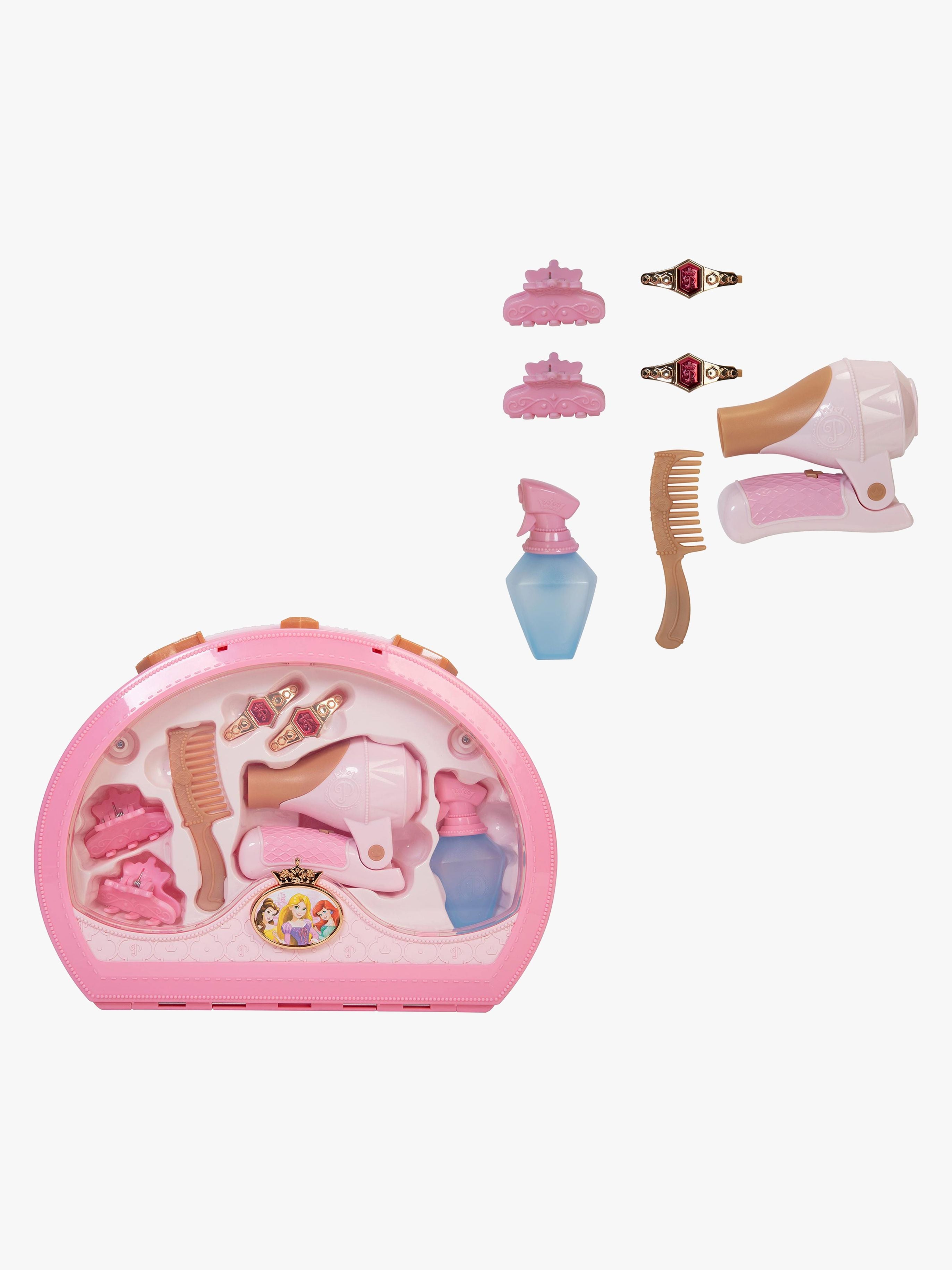 Rejsesæt med en praktisk kuffert. Det har et sødt design i flotte farver. Perfekt at have med på farten. - Indeholder: 1 hårtørrer, 1 kam, 1 sprayflaske, 1 kuffert, 4 hårspænder. - Lydeffekter. - Få et makeup- eller hårsæt. - Let at opbevare. - Udvikler kognitive og finmotoriske færdigheder. - CE-mærket. - Anbefalet alder: Fra 3 år. - - Batterier medfølger ikke.