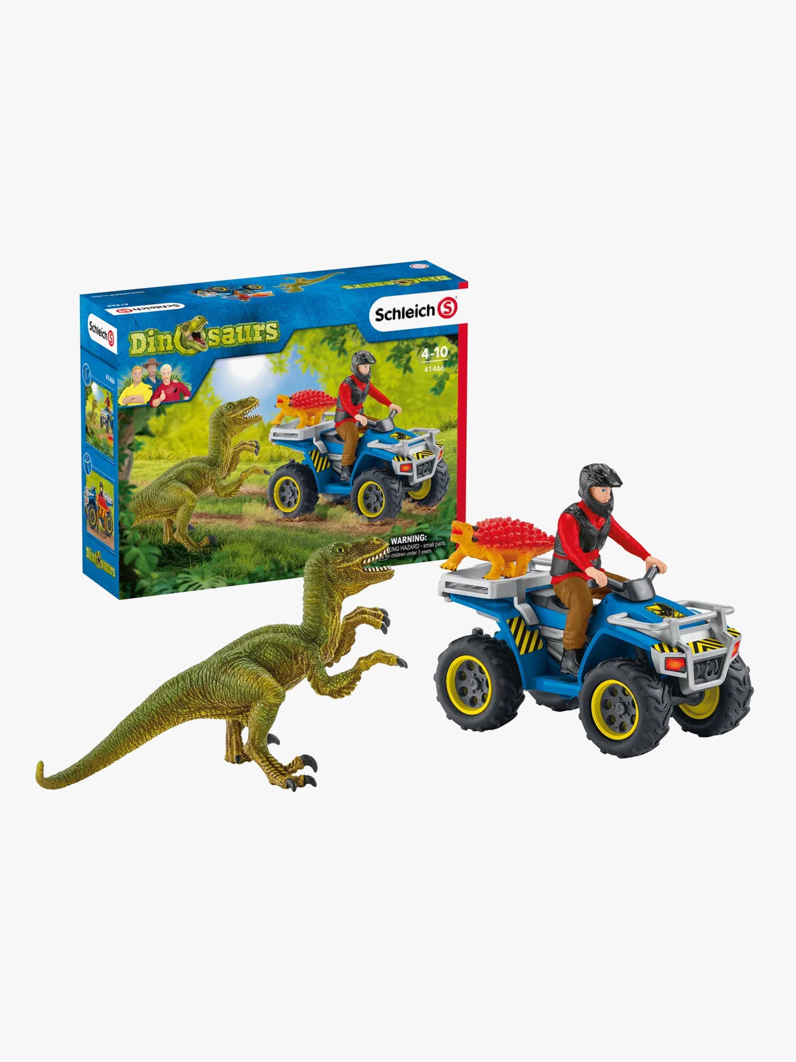 Flygt fra den farlige velociraptor på quadbiken, og red den lille ankylosaur, så den ikke bliver ædt. Dinosauren er hurtig med ATVen er hurtigere. Sæt ankylosauren på bagagebæreren, tag hjelmen på og kør afsted, så hurtigt du kan. Sættet indeholder en velociraptor, en ankylosaur, fører og en ATV. Anbefalet alder: Fra 4 år.