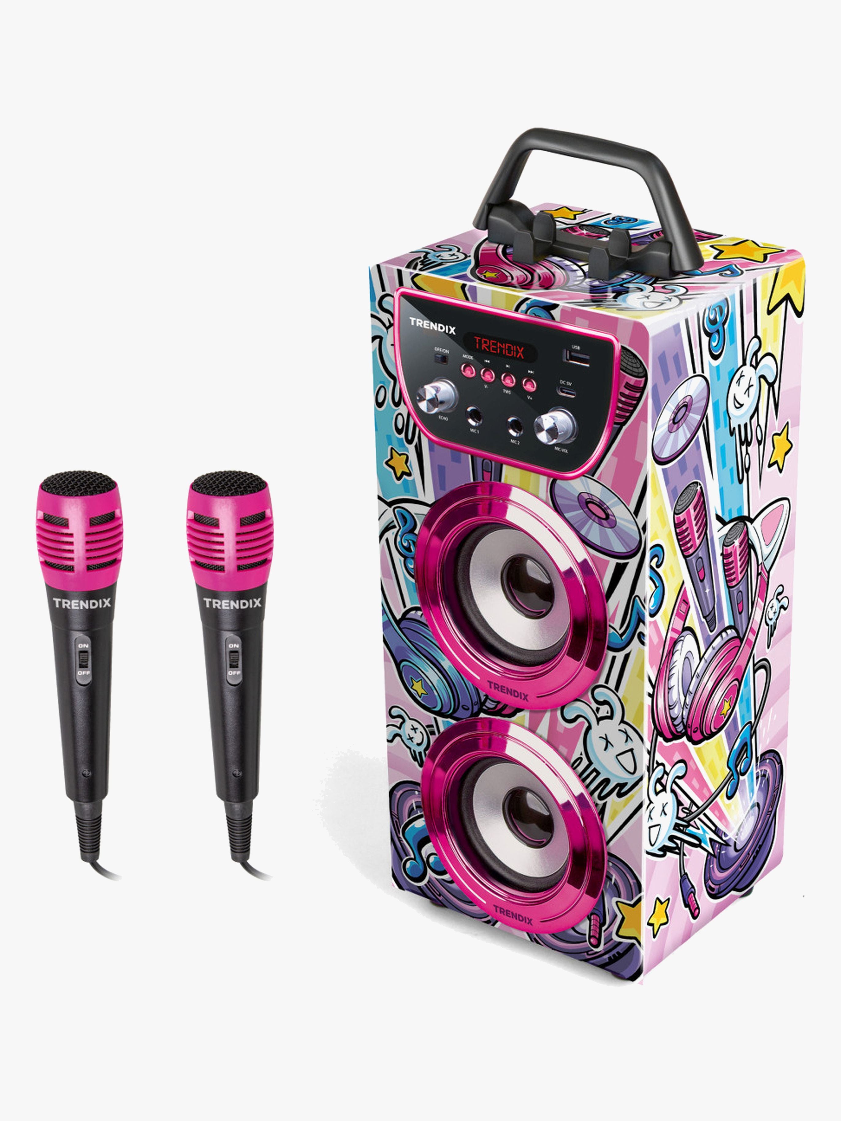 Karaokemaskine fra Trendix med et detaljeret design i flotte farver. Den har 2 medfølgende mikrofoner og en indbygget mobilholder, så du lettere kan læse sangteksterne fra din mobiltelefon. Perfekt til mange timers sjov. - Bluetooth. - 10W højttaler. - Lyseffekter. - Volumenkontrol. - Tilslut 2 højttalere for mere fyldig lyd. - Mobilholder. - FM-radio. - Genopladeligt batteri. - CE-mærket. - Anbefalet alder: Fra 5 år. - Batterier medfølger.