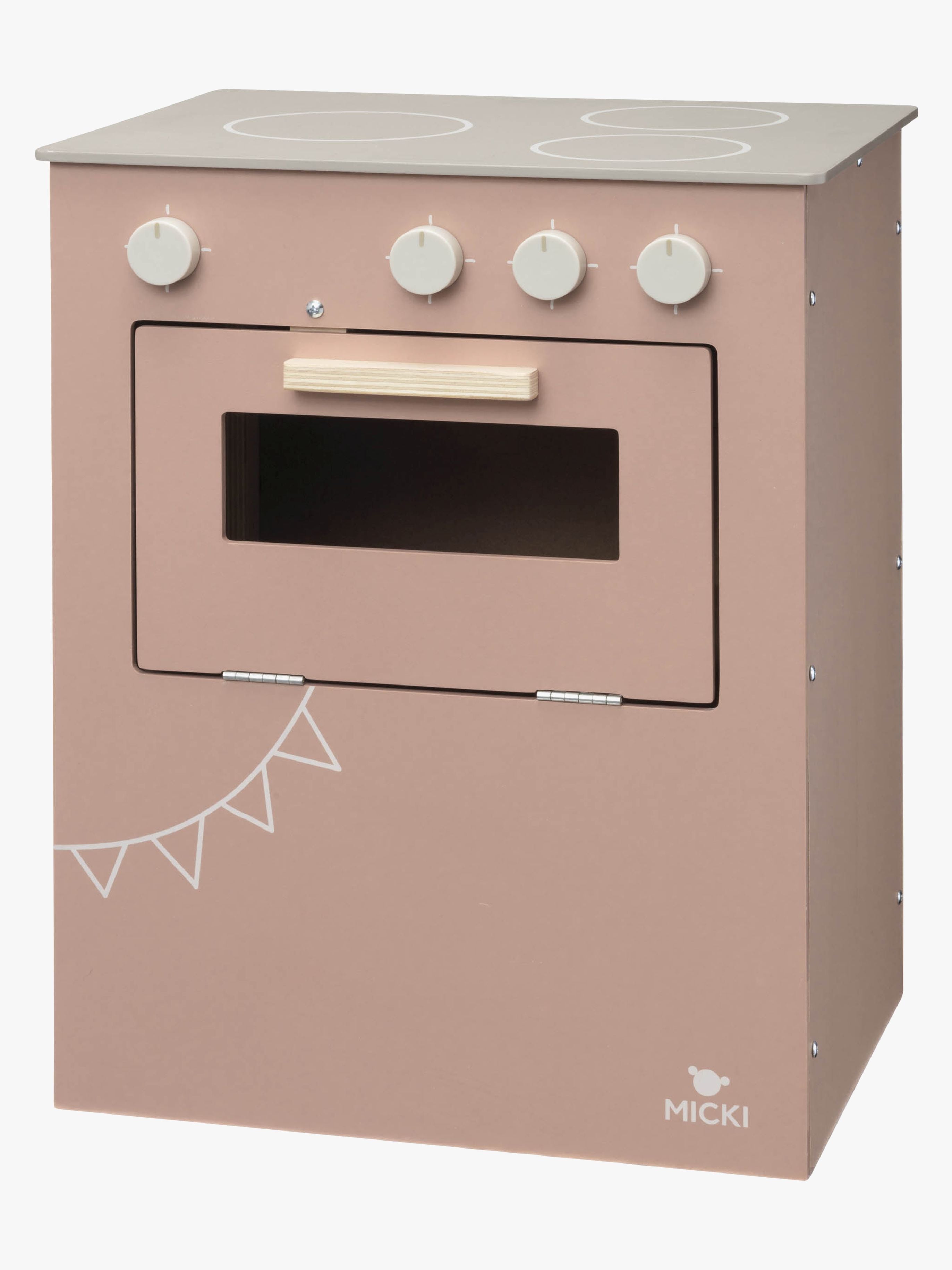 Klassisk, stabilt komfur fra Micki med tre kogeplader. Det har en ovn med en åbningsbar låge og fire knapper med kliklyde. Perfekt til den lille mesterkok. - CE-mærket. - Ikke egnet til børn under tre år på grund af små dele. - Anbefalet alder: Fra 3 år. - Træ, MDF.