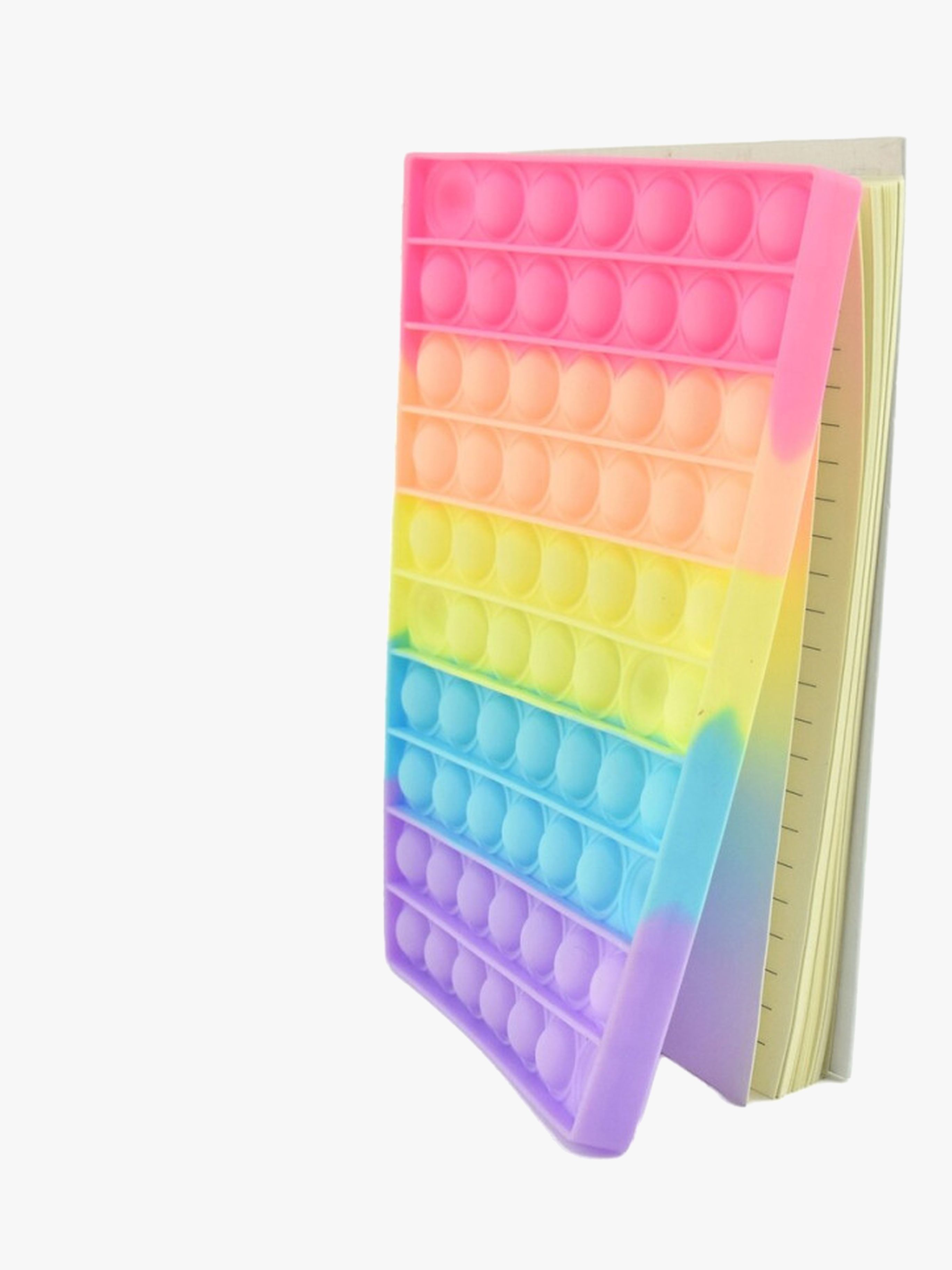 Notesbog fra Robetoy med et sjovt Pop-it fidget-legetøj foran med forskellige farver. Den har linjerede, gule sider indeni. Perfekt til kreative aktiviteter. CE-mærket. Linjerede sider. Både en notesbog og et fidget-legetøj. Anbefalet alder: Fra 5 år. Plastik, papir.
