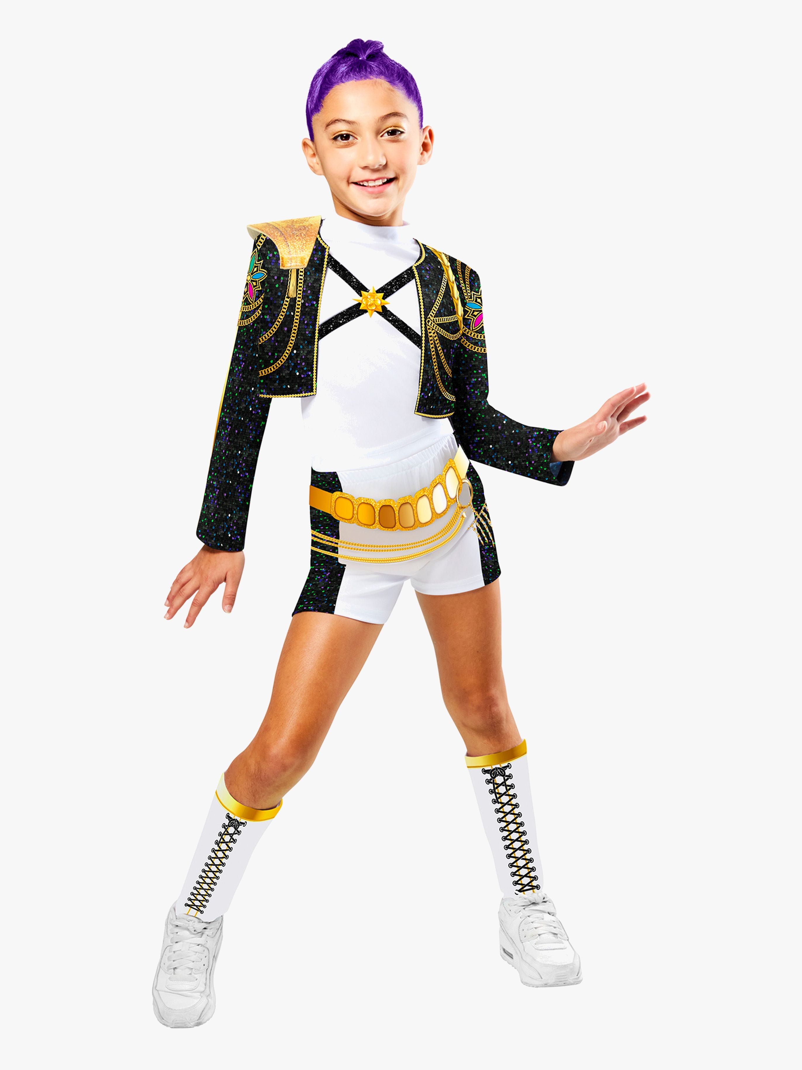 Kostume fra Rubies til at klæde sig ud som Rumi fra den populære film. Det har en top med glitrende, printede detaljer og matchende shorts med elastisk talje og et guldfarvet 3D-bælte. Kostumet har tilhørende benvarmere for at fuldende outfittet. Perfekt til udklædning og rolleleg. - Tryl dig selv til din yndlingsfigur. - Elastisk talje. - Velcrolukning. - Fine trykte detaljer. - Perfekt til alle K-Pop Demon Hunters-fans. - Til sjov og fantasifuld rolleleg. - CE-mærket. Indeholder: top, shorts med et 3D-bælte, benvarmere. - Anbefalet alder: Fra 6 år. - 100 % polyester.