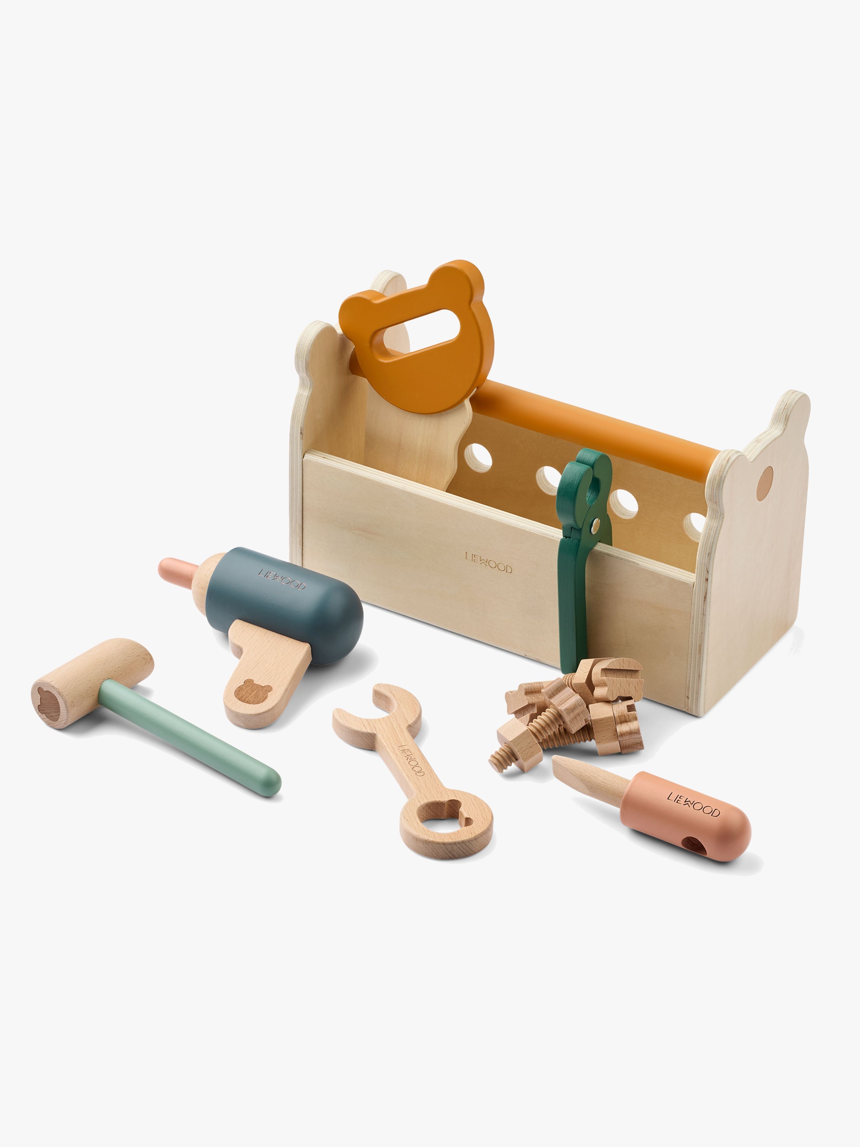 Værktøjskasse fra LIEWOOD med mange forskellige værktøjer til at bygge med. Perfekt til mange timers sjov. - Indeholder: 6 værktøjer, 4 bolte, 1 værktøjskasse. - Let for små hænder at gribe om. - Let at opbevare. - Opmuntrer brug af finmotorik og stimulerer kreativitet og fantasi. - Rengøres på overfladen med en fugtig klud. - Godkendt i henhold til EN71. - CE-mærket. - Anbefalet alder: Fra 1,5 år. - Bøgetræ, krydsfiner.