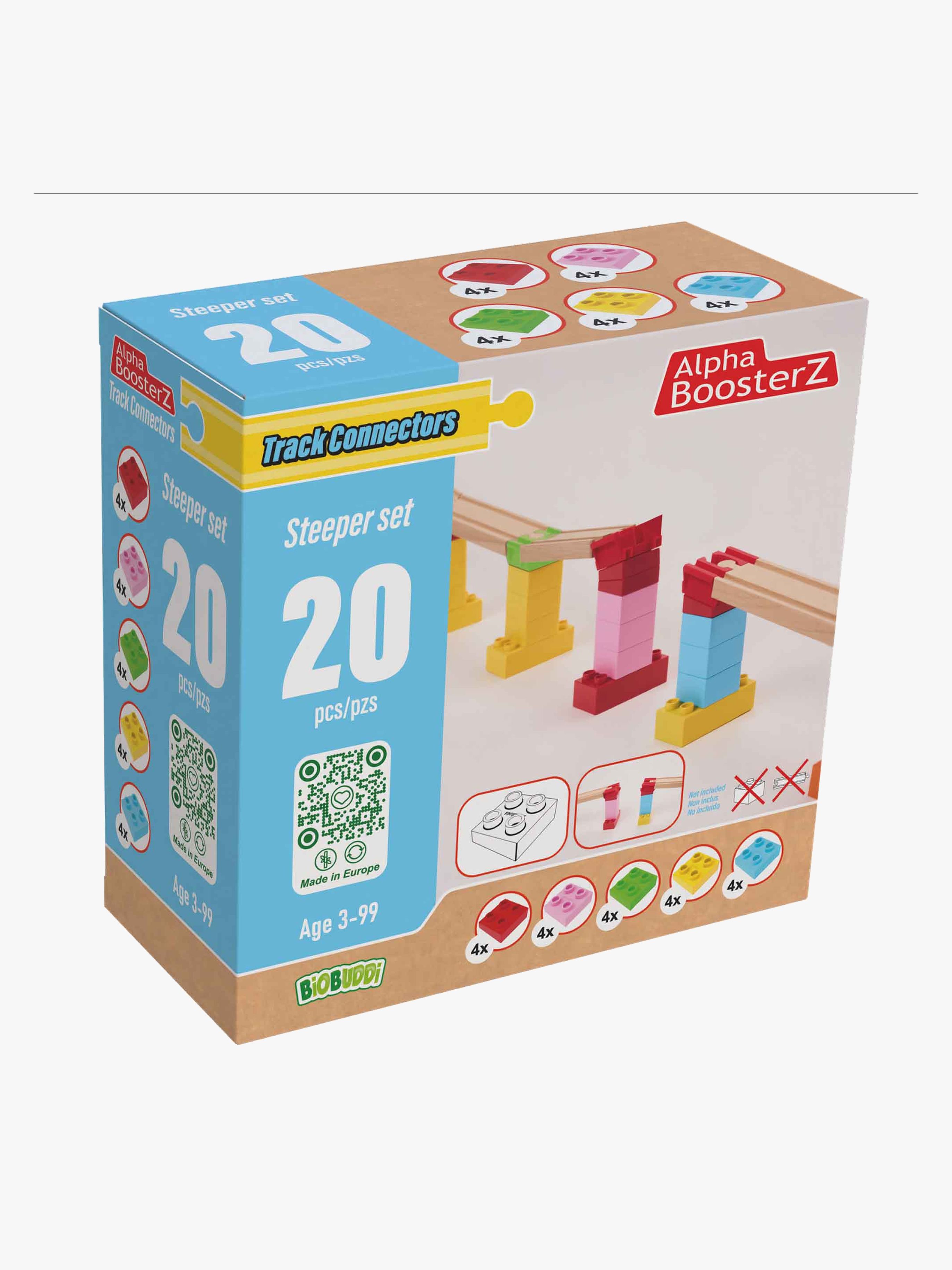 ByggesÊt fra Alpha BoosterZ med 20 stejle BioBuddi-byggeklodser til at designe og bygge togbaner i det uendelige! Perfekt til timevis af kreativitet og leg. - 20 dele. - Indeholder: 20 BioBuddi Steep-byggeklodser. - Byg spÊndende baner. - ”2 x 2” byggeklodser. - Kompatibel med andre populÊre mÊrker, der laver togbaner og byggeklodser af trÊ. - OBS: Tog og togskinner medfÊlger ikke. - Saml pÃ¥ alle produkterne i serien. - Fremstillet af et restprodukt fra forarbejdning af sukkerrÞr. - CE-mÊrket. - Anbefalet alder: Fra 3 Ã¥r. - SukkerrÞr, karton.