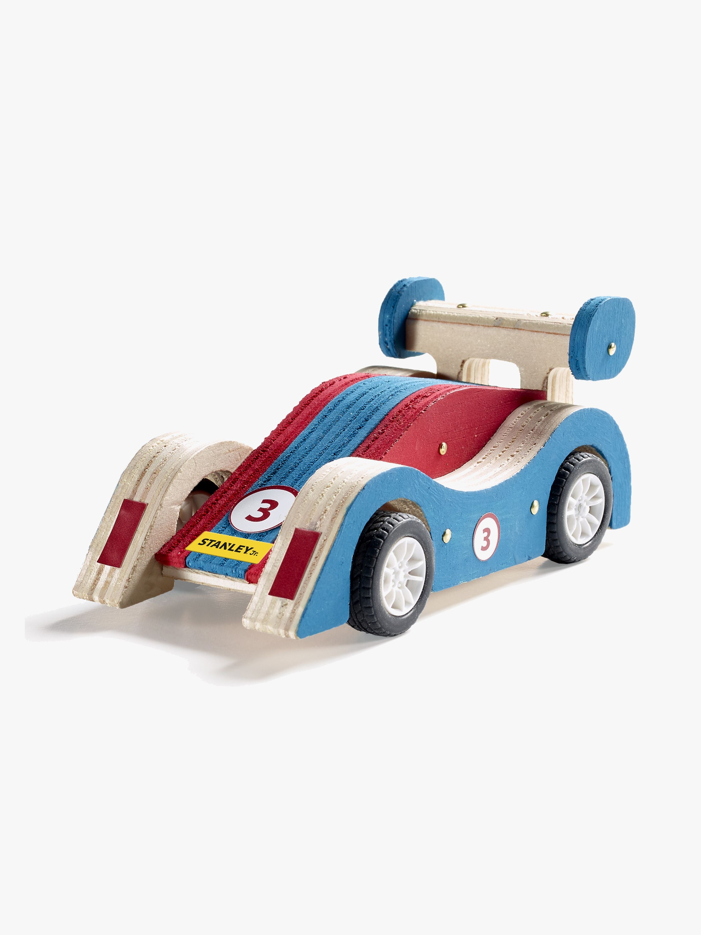 Sportsvogn i træ fra Stanley Jr. Byg og mal din egen sportsvogn ved hjælp af tilhørende komponenter. Træk bilen tilbage og slip den, og så kører bilen hurtigt fremad! Ikke egnet til børn under 3 år på grund af små dele.