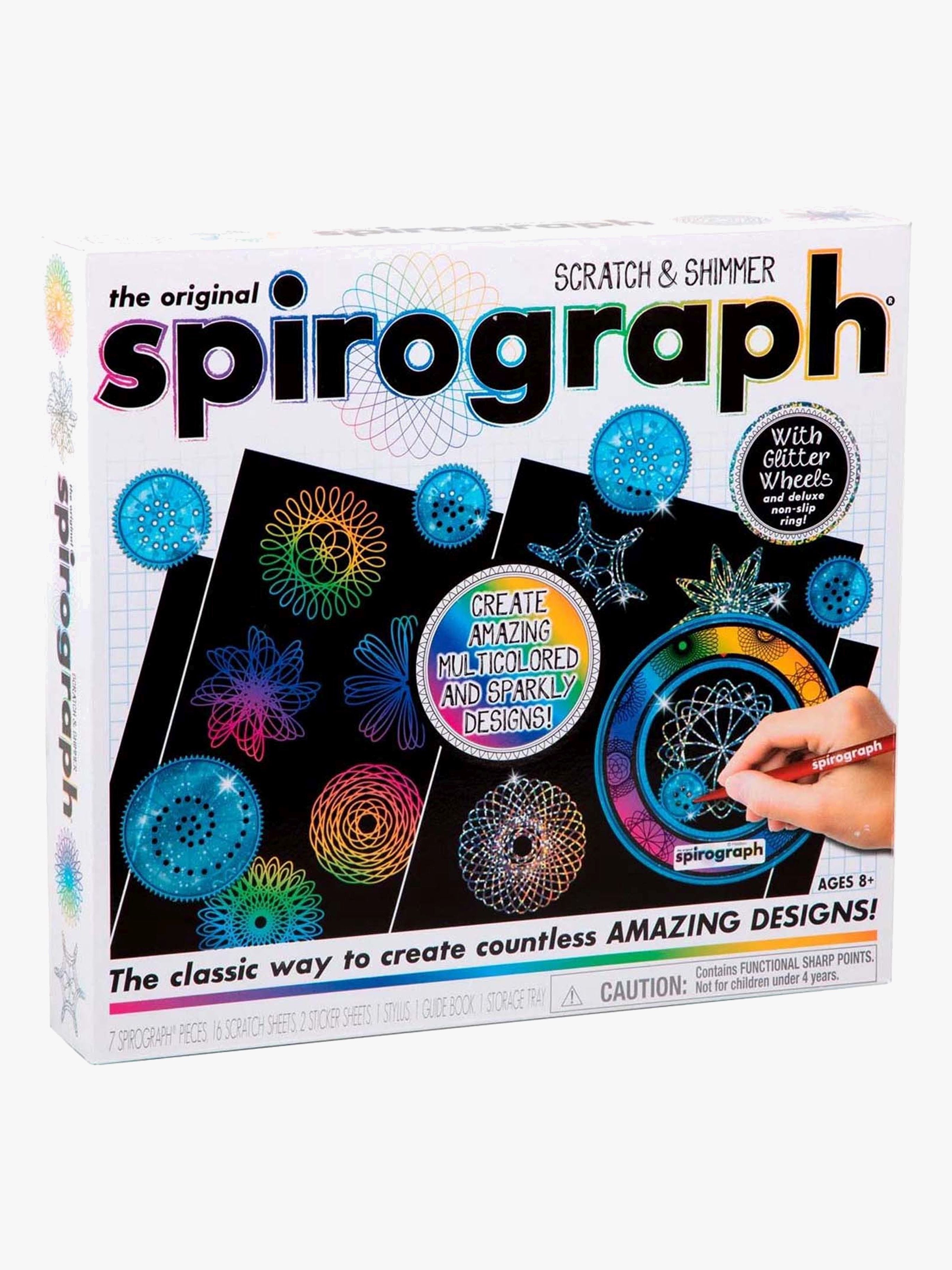 Tegneværktøj fra Spirograph. Skrab og skab glitrende, skinnende mønstre på sorte papirark. Indeholder: 1 tegneværktøj, 1 deluxering med skridsikker belægning, 6 glitterhjul, 16 skrabeark og klistermærker. CE-mærket. Anbefalet alder: Fra 8 år.