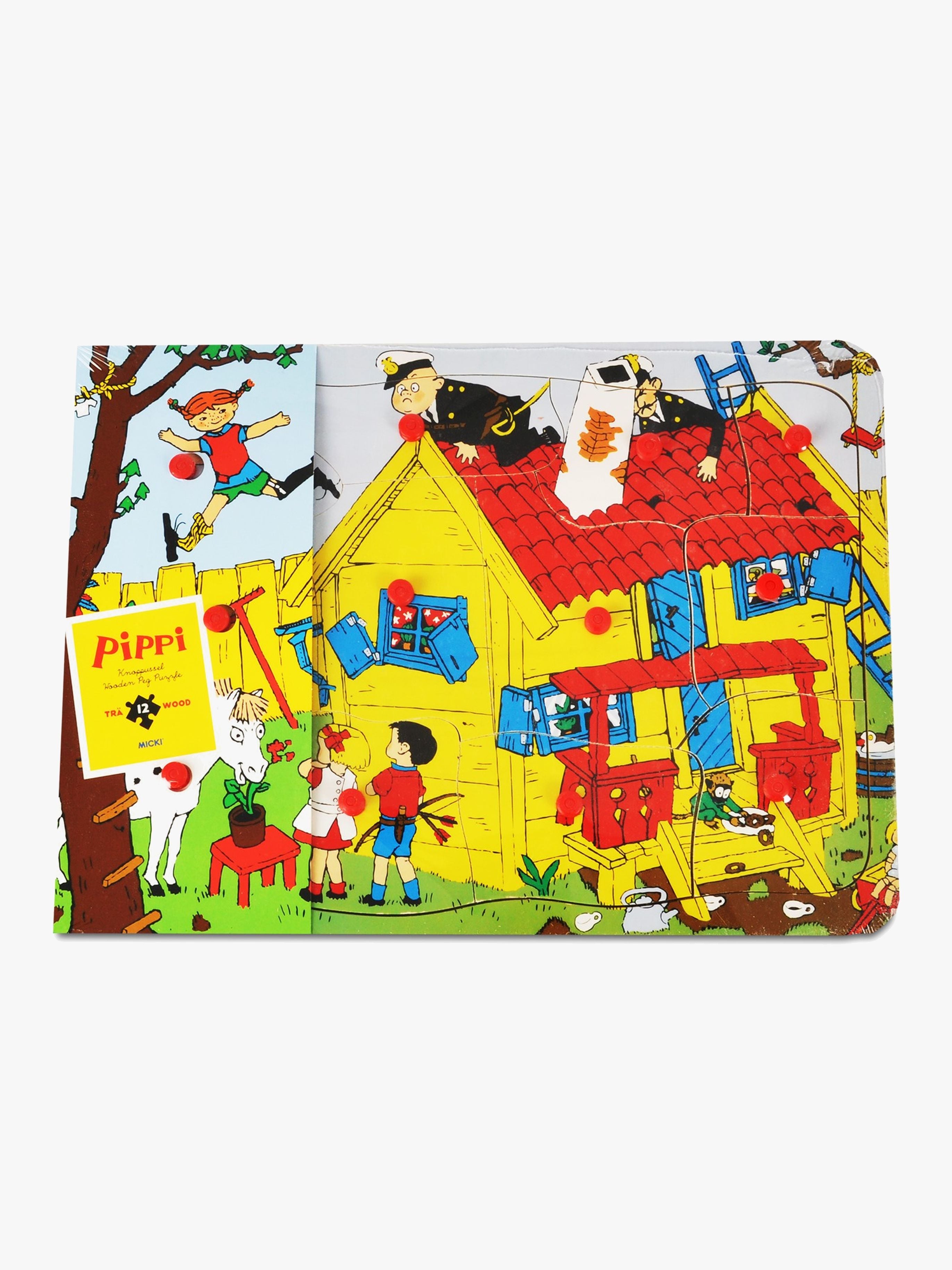 Farverigt træpuslespil med Pippi Langstrømpemotiv. Læg brikkerne en efter en, og se motivet vokse frem. Puslespilsbrikkerne har små knapper man kan holde i, og lægges i en ramme, hvilket hjælper dit barn i gang. Illustrationerne er lavet af Ingrid Vang Nyman. Anbefalet alder: Fra 18 måneder.