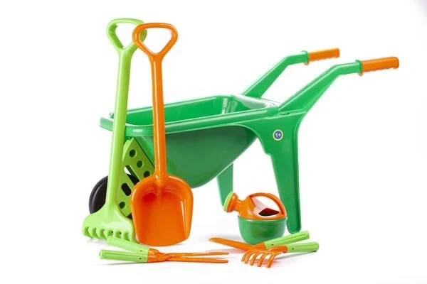 Flot og vellavet trillebør i god kvalitet til de store sandkasseprojekter. Sammen med trillebøren følger der en rive, skovl, vandkande, hækkesaks, plantesskovl og planterive.