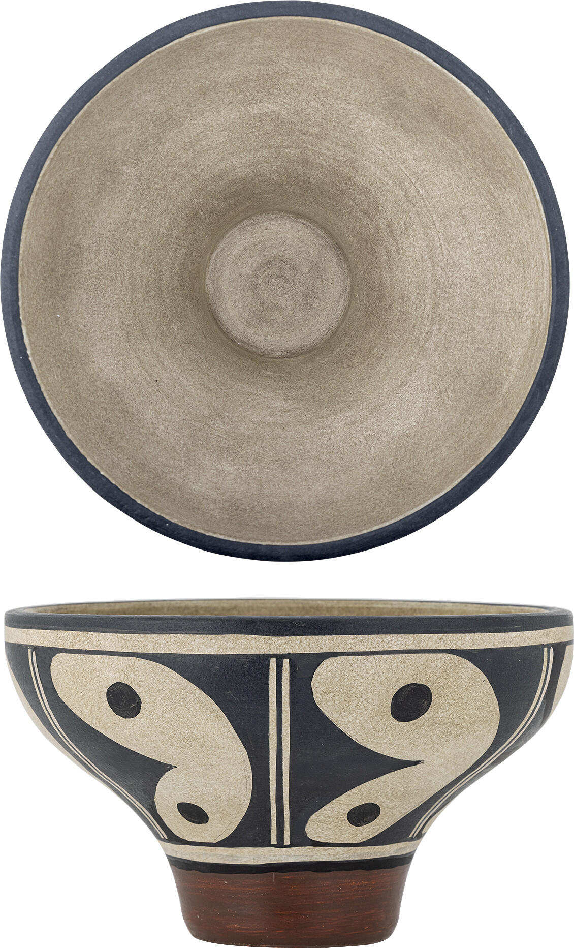 Elfrida Skålen fra Bloomingville er lavet af terrakotta med en dyb sort bund og dekorative mønstre...