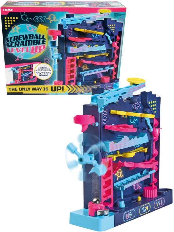 Et nyt vertikalt twist på det populære spil Screwball Scramble. Level Up sender din kugle fra bunden til toppen, mens du undviger og erobrer et dusin nye forhindringer ved hjælp af kun tre kontroller. Perfekt til mange sjove spiløjeblikke. - Spil alene, og sæt en tid du vil slå, eller spil i par med familie og venner. - Spændende tilføjelse til det klassiske spil Screwball Scramble. - Kan sættes sammen med Screwball 1 & 2. - CE-mærket. - Anbefalet alder: Fra 5 år. - Plastik.