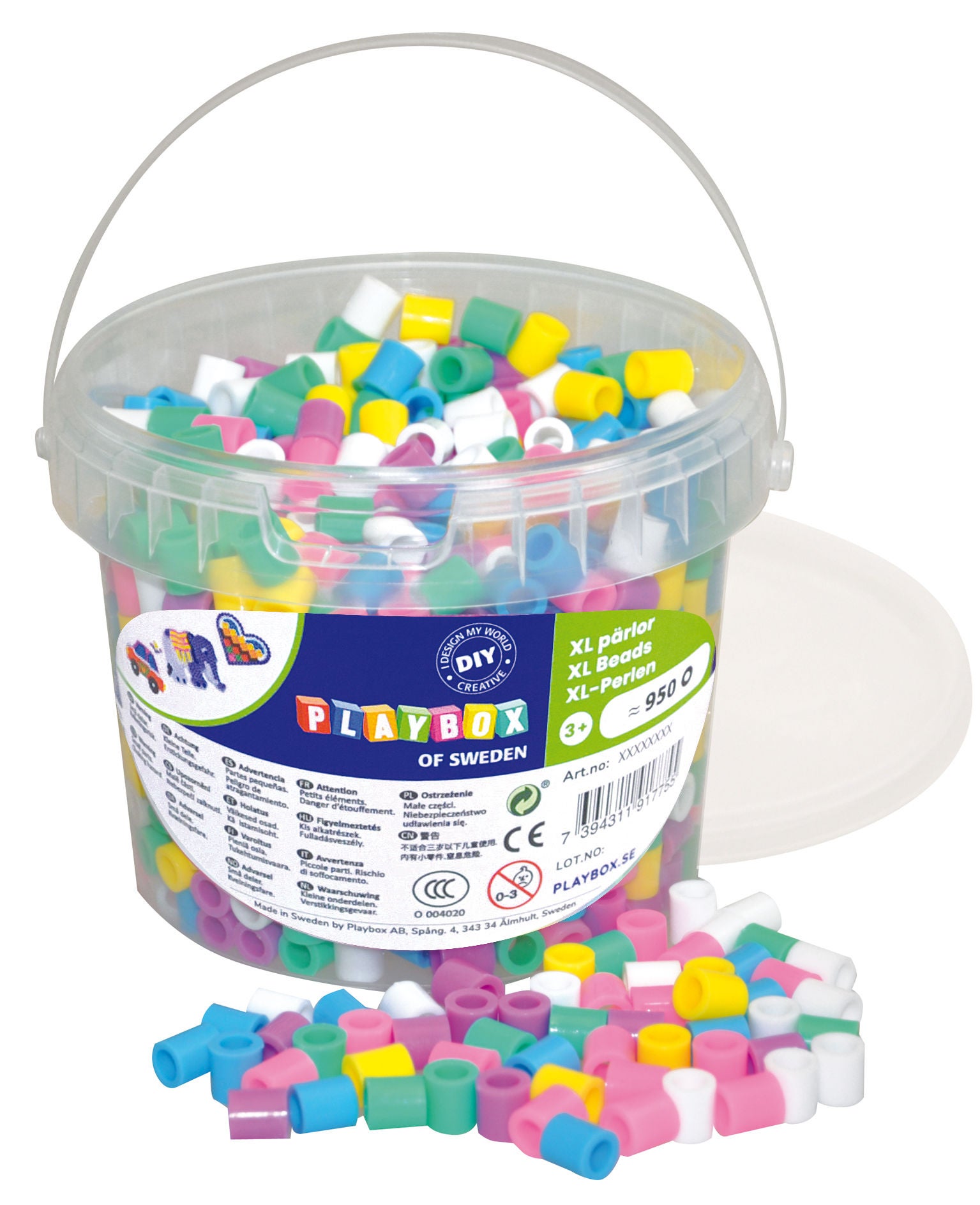 Store perler fra Playbox i en skøn pastelblanding. Lad børnene lave deres egne billeder og motiver. Disse store perler er perfekte til de lidt yngre børn, da de er lettere at håndtere. Dit barn øver både finmotorikken og koordinationsevnen, når det trækker dem på en tråd eller lægger dem på perlepladen. - 950 stk perler indgår. Anbefalet alder: Fra 3 år.