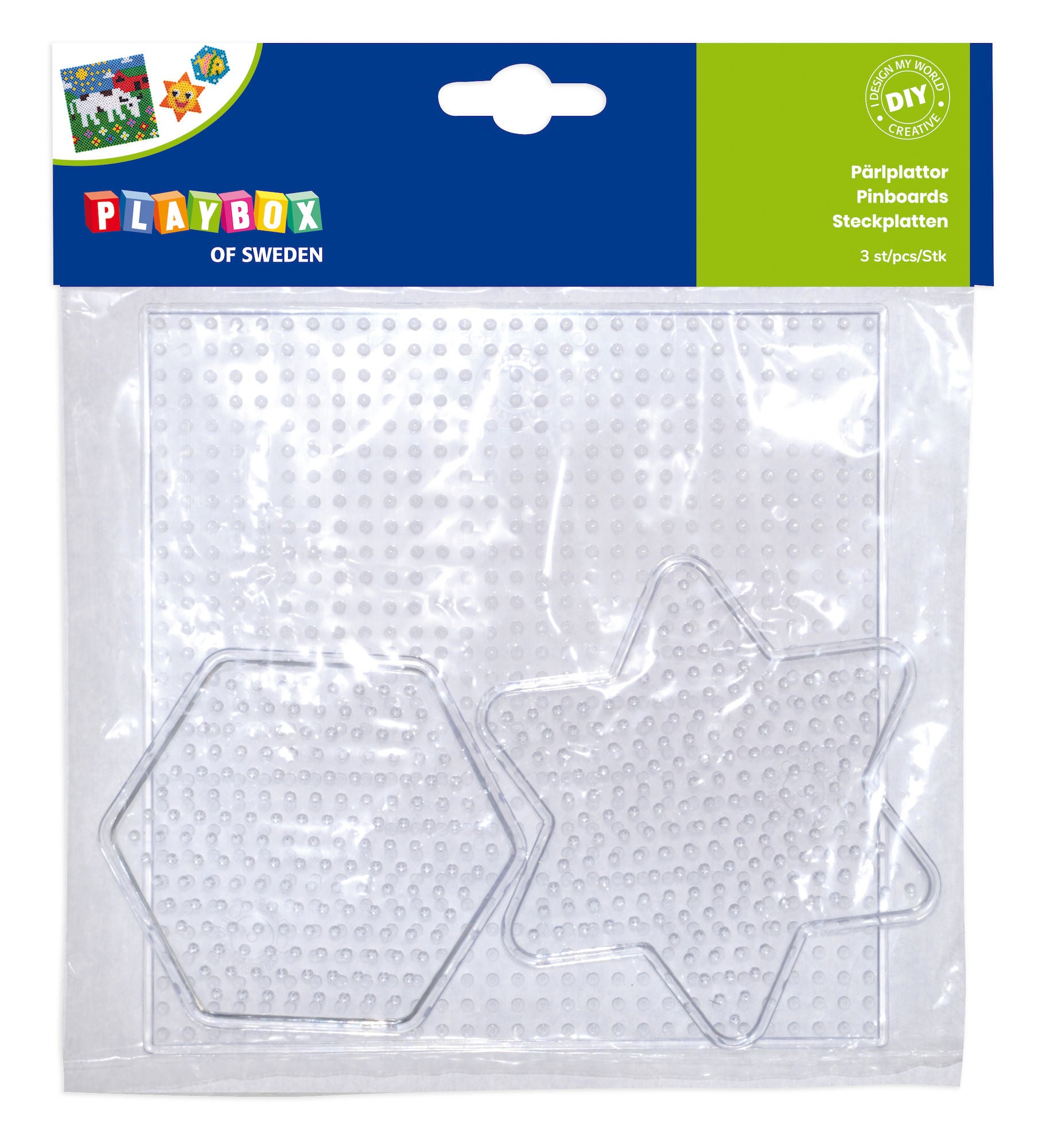 Med disse perleplader fra Playbox kan du skabe fine motiver i forskellige farver. Du får tre perleplader med i forskellige former (heksagon, kvadrat, stjerne) og størrelser. Pladerne passer til miniperler fra Playbox. Anbefalet alder: Fra 5 år.