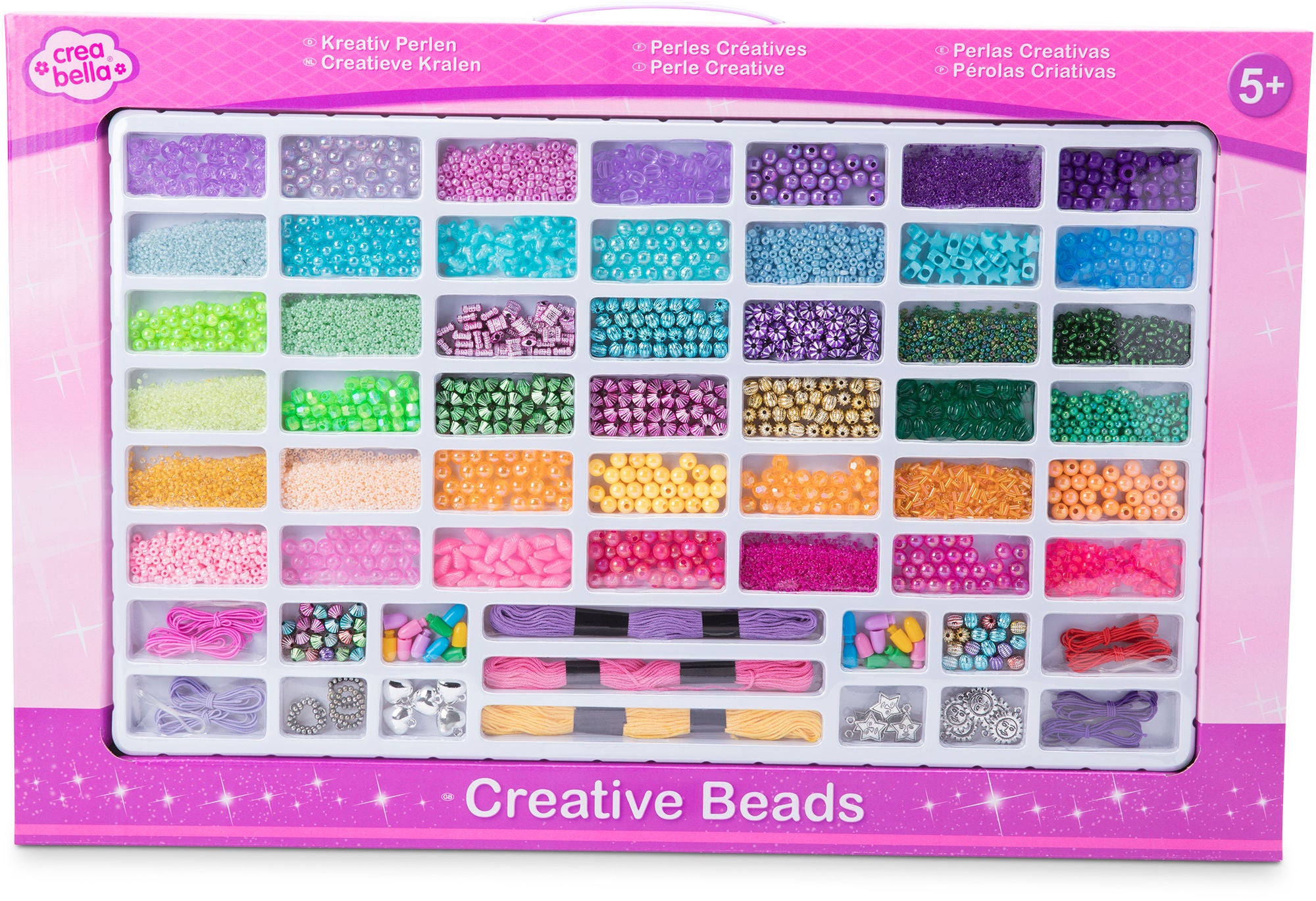 Er der kreative børn i familien, så er det store sæt perler fra Crea Bella noget for jer. Dette sæt perler inkluderer tråd og fine perler med forskellige former og farver. Så er det pludselig spændende at lave flotte smykker til sig selv og hele familien. Anbefalet alder: Fra 5 år. Mål i emballage: L59 x B38,5 x H4 cm. Materiale: Plastik.