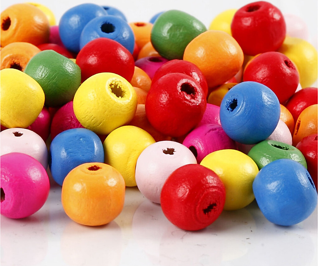 Fine runde træperler af farvet træ i assorterede farver til kreative hjemmeprojekter. Alle...