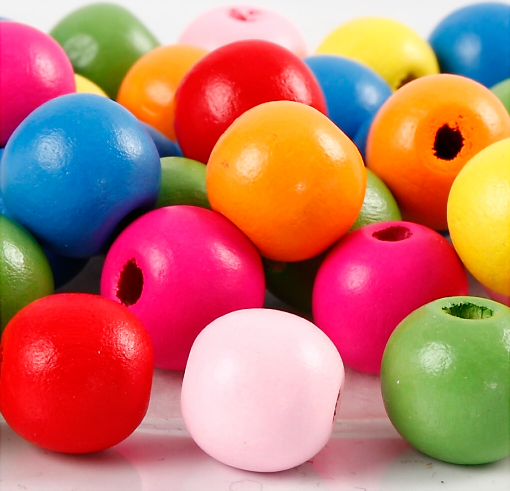Fine runde træperler af farvet træ i assorterede farver til kreative hjemmeprojekter. Alle...