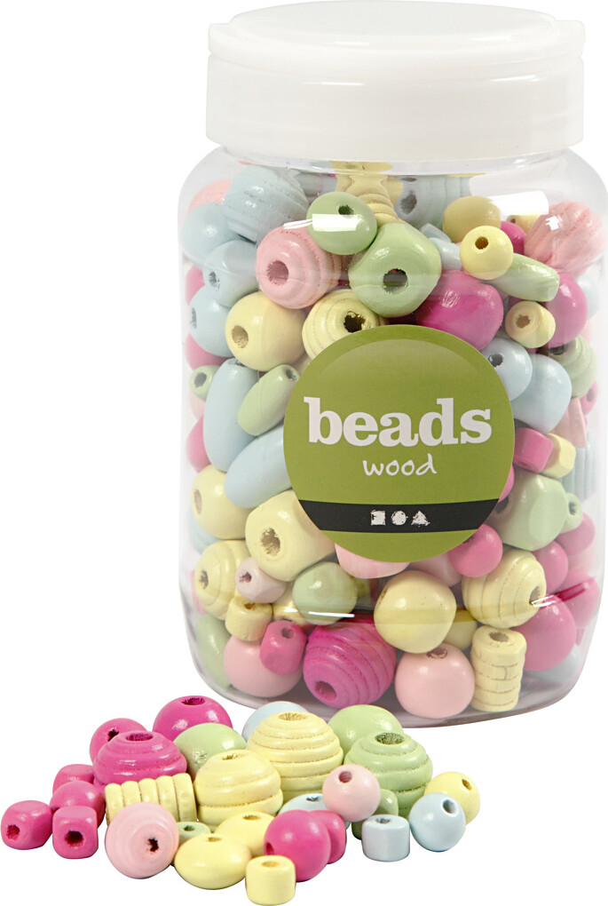 Træperler - ø 10-15 Mm - Hulstr. 3-5 Mm - Lyseblå - Lys Grøn - Lyserød - Lys Gul - 400 Ml/ 1 Spand